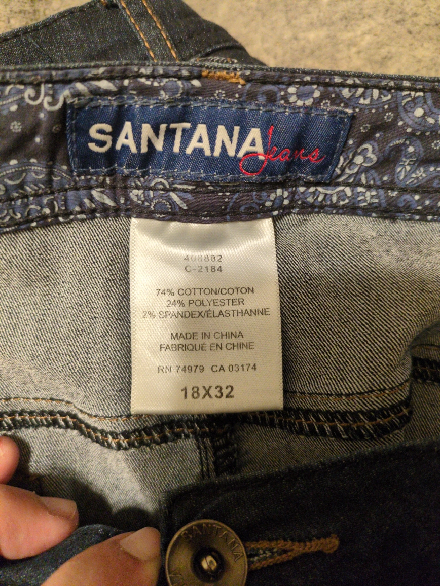 Selling a pair of Santana jeans in size 18x32. The jeans are made of 74% cotton, 24% polyester, and 2% spandex/elasthanne. They are in great condition and ready for a new home! Only worn a couple of times.
