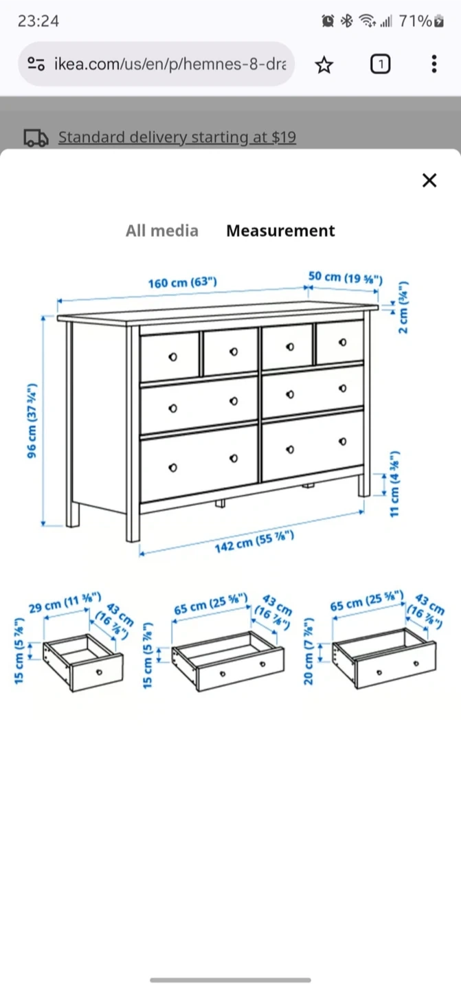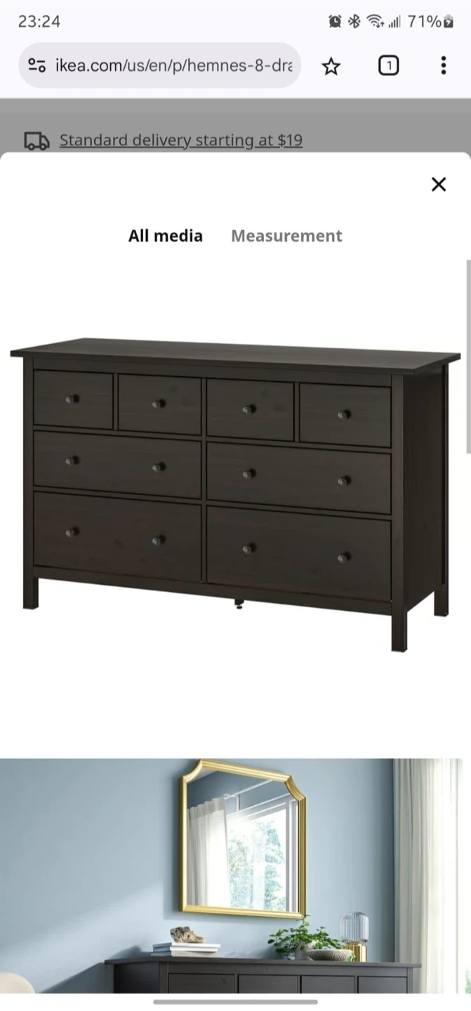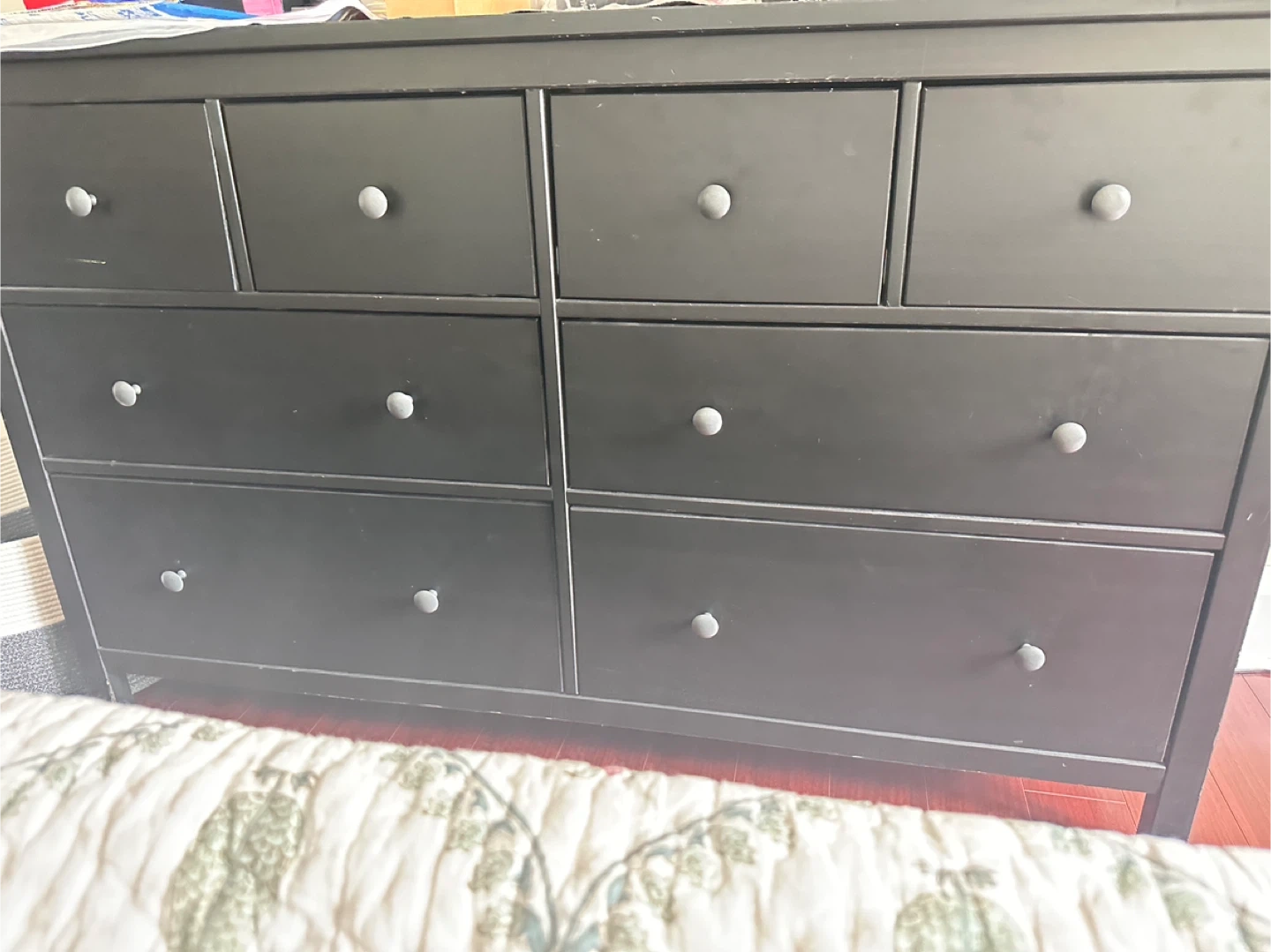 Selling a used IKEA Hemnes 8-drawer dresser. It's a great piece for adding storage to any bedroom or living space. The dresser features eight drawers of varying sizes. Dimensions are 160 cm (63") wide, 96 cm (37 3/4") high, and 50 cm (19 3/4") deep