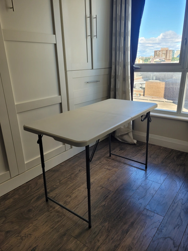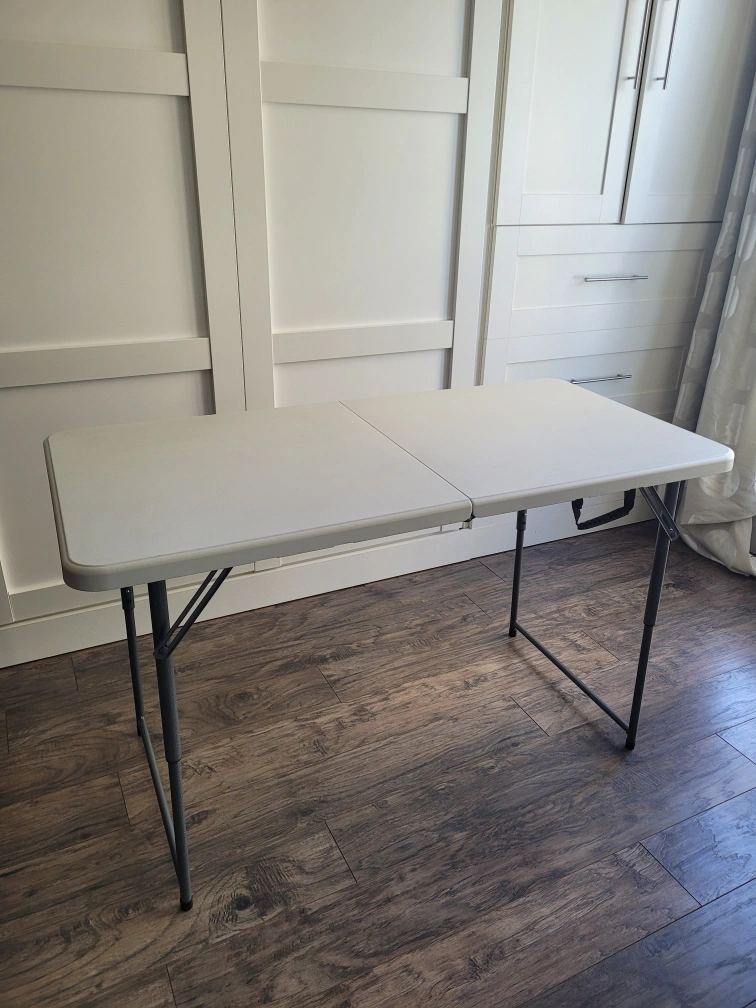 Selling a handy folding table from Canadian Tire. It's in great shape and perfect for small spaces or when you need an extra surface. Easy to store and set up, making it ideal for crafting, dining, or as a temporary workspace. Depth = 61 cm Lenght = 123 cm Height = 74 cm