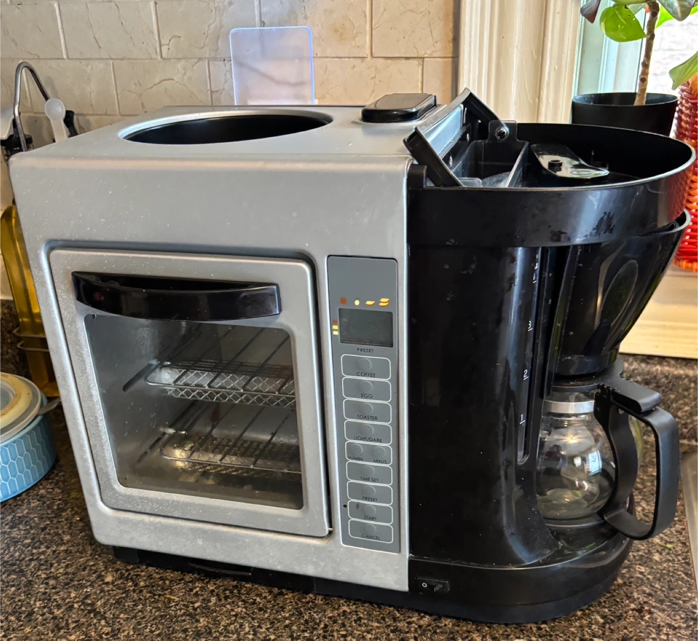 This is a Mini Kitchen … toaster oven + coffee maker + egg maker combo! It's in good working condition and would be great for a bachelor or couple in small apartment or for a small office.