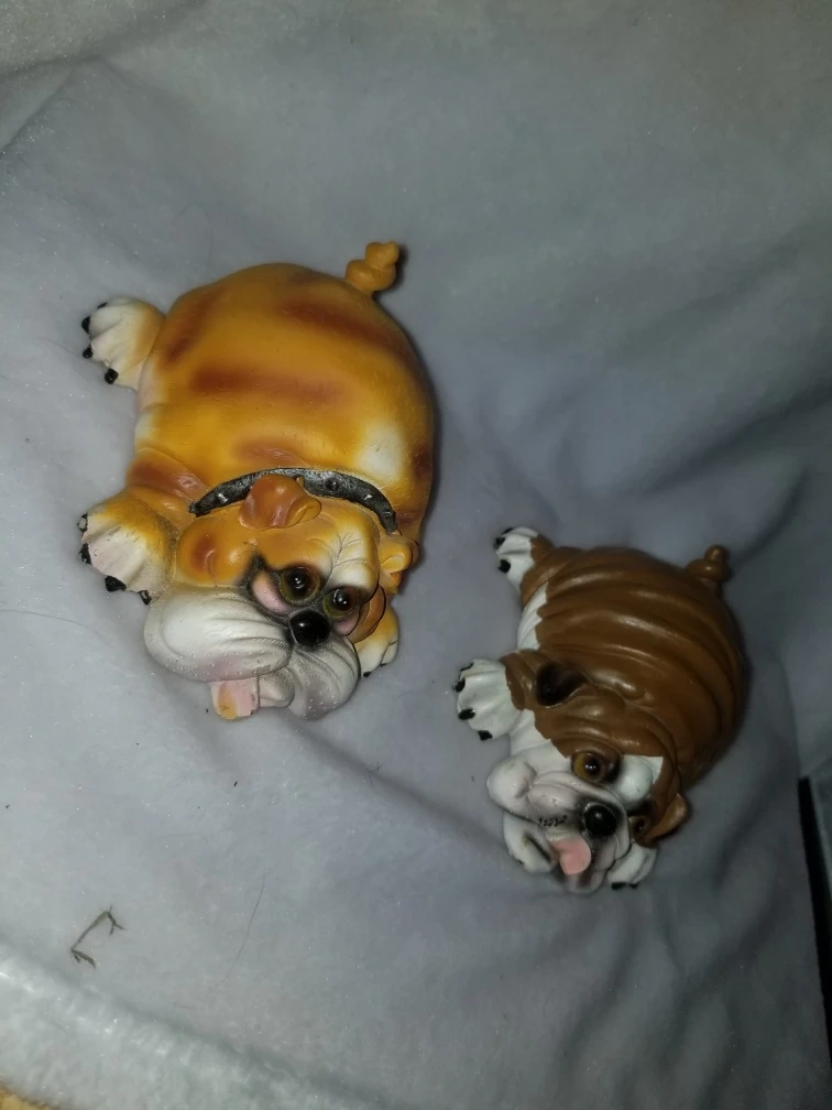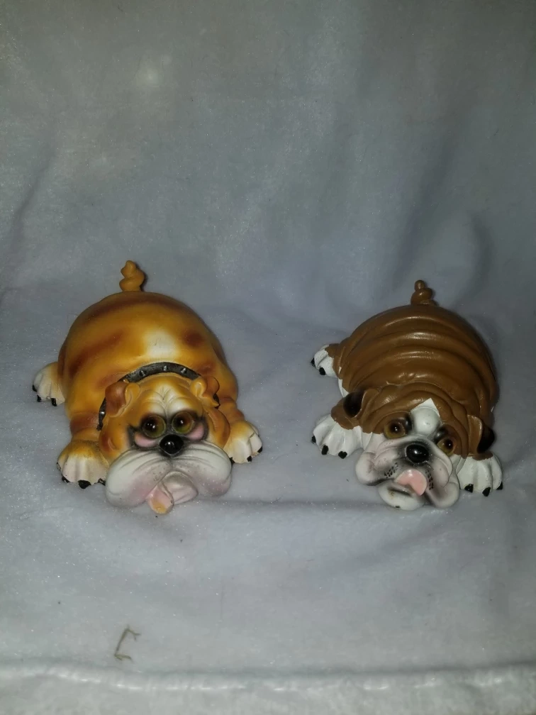 Selling a set of two adorable bulldog figurines! One is a light brown/orange colour and the other is a darker brown. They would look great on a shelf or desk!