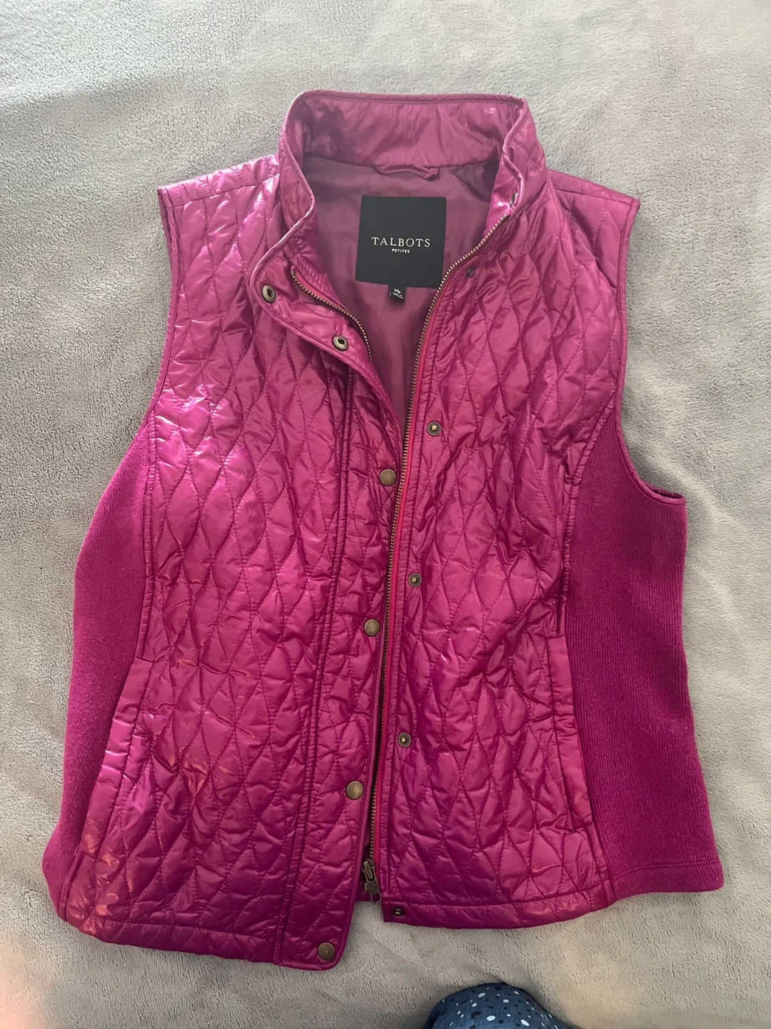 Selling a Talbots Woman puffer vest in a vibrant pink! It's a size M and features a quilted design. Perfect for adding a pop of colour to your wardrobe and staying warm on chilly days