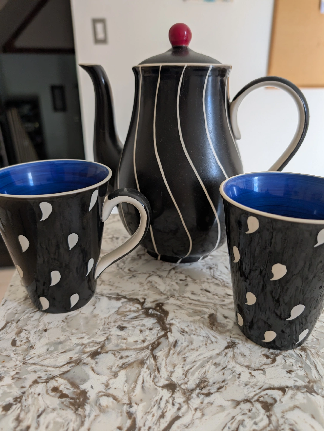 This is a charming teapot set that includes two mugs. The teapot is black with white stripes, and the mugs are black with white raindrop-like markings and a blue interior. It's a unique set to add to your collection!