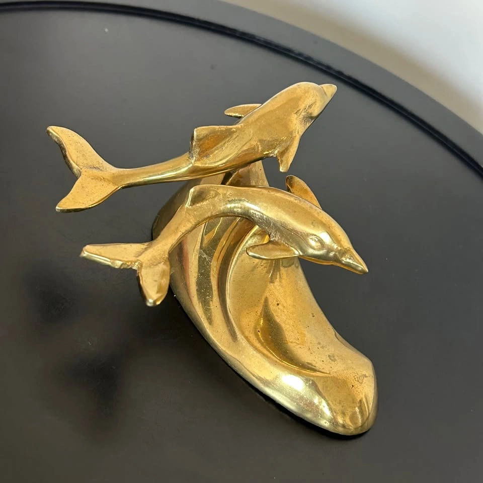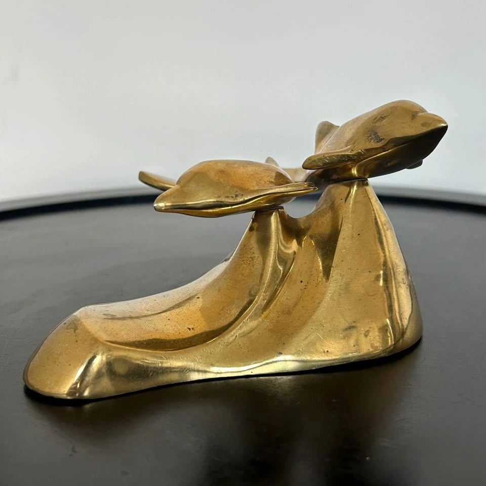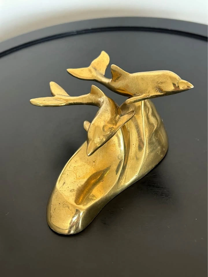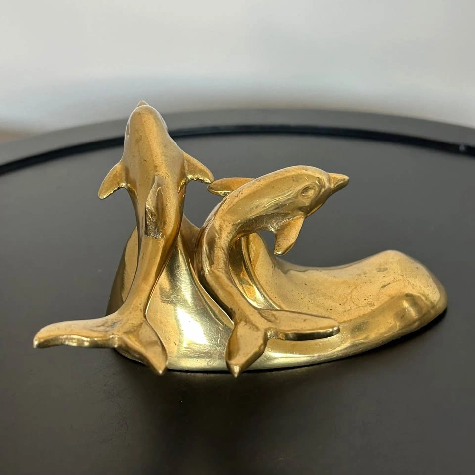 Small brass sculpture featuring dolphins riding an ocean wave. A charming decorative piece for your home, office, or nautical-themed collection. Beautiful craftsmanship. Pick up: Seton area, Calgary. See also my other lots. Open to your questions and suggestions. If necessary, I provide additional photos. These are not new things, so please look carefully at the photos and videos. Sizes are submitted on request and also using a tape measure in the photo.