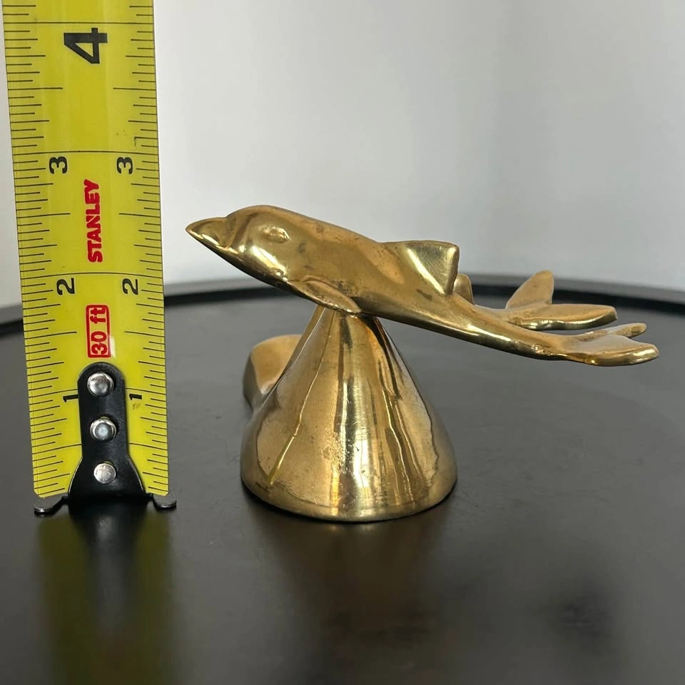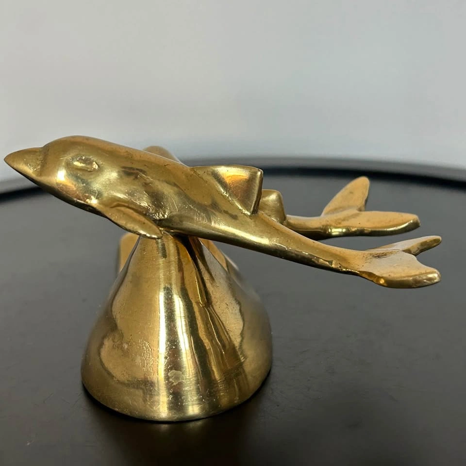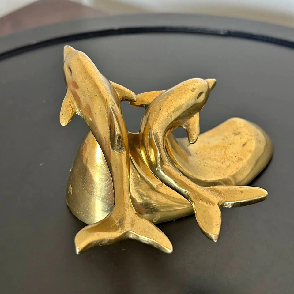 Small brass sculpture featuring dolphins riding an ocean wave. A charming decorative piece for your home, office, or nautical-themed collection. Beautiful craftsmanship. Pick up: Seton area, Calgary. See also my other lots. Open to your questions and suggestions. If necessary, I provide additional photos. These are not new things, so please look carefully at the photos and videos. Sizes are submitted on request and also using a tape measure in the photo.