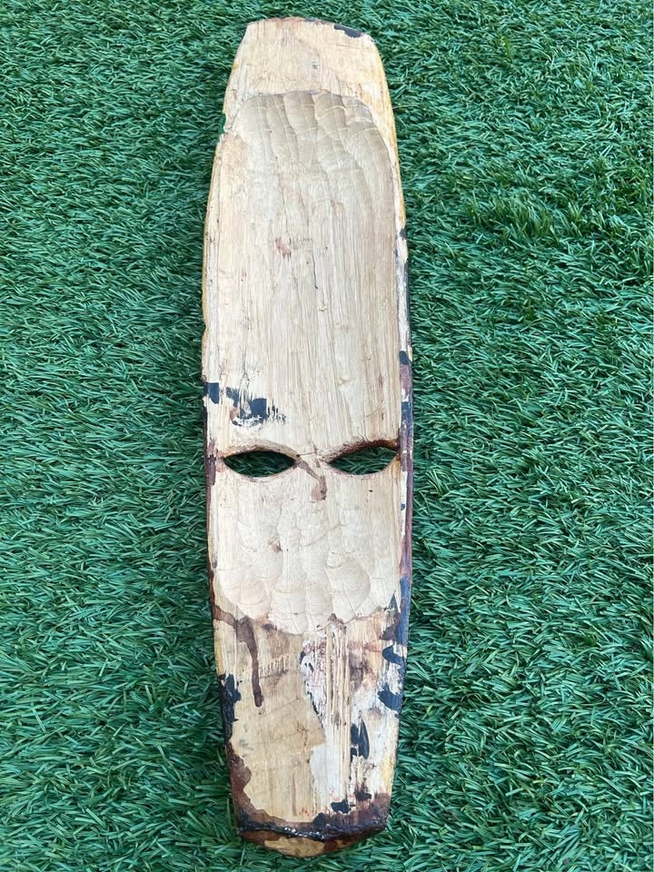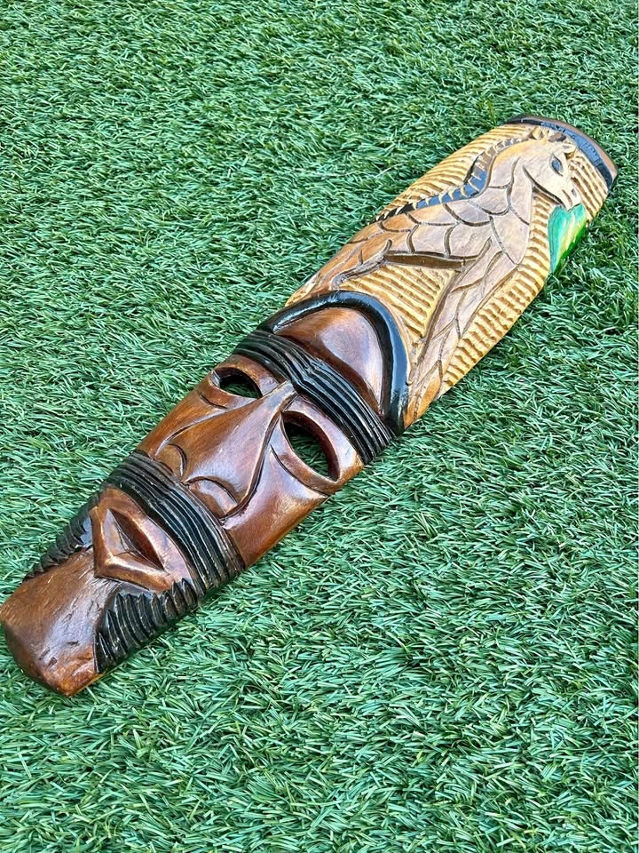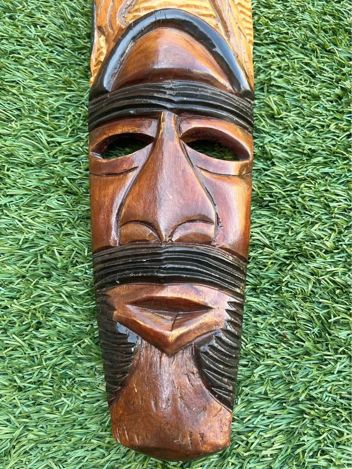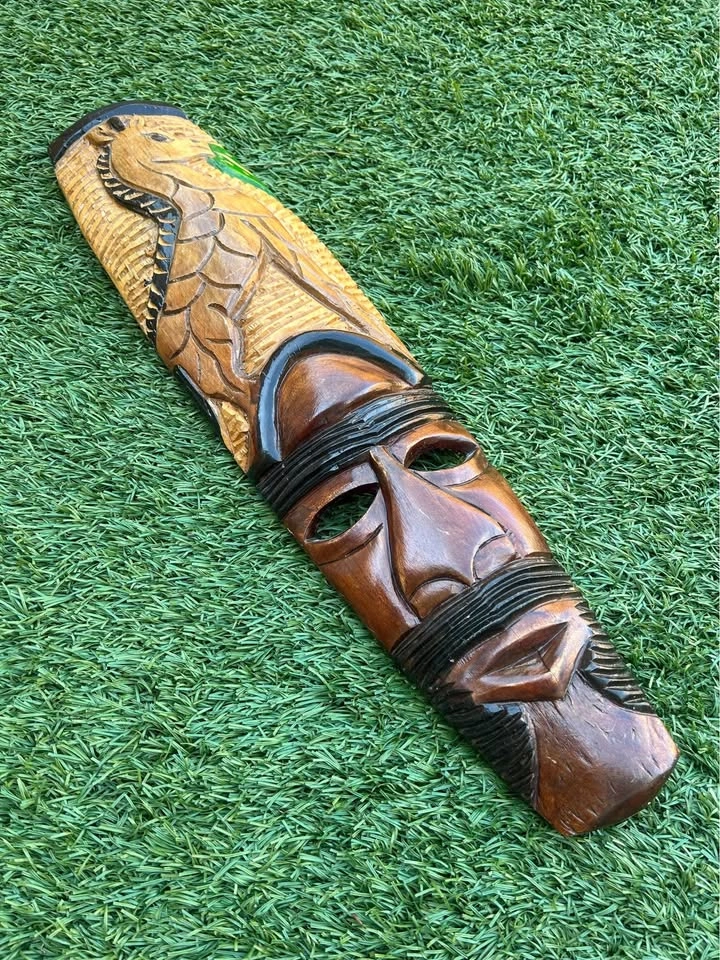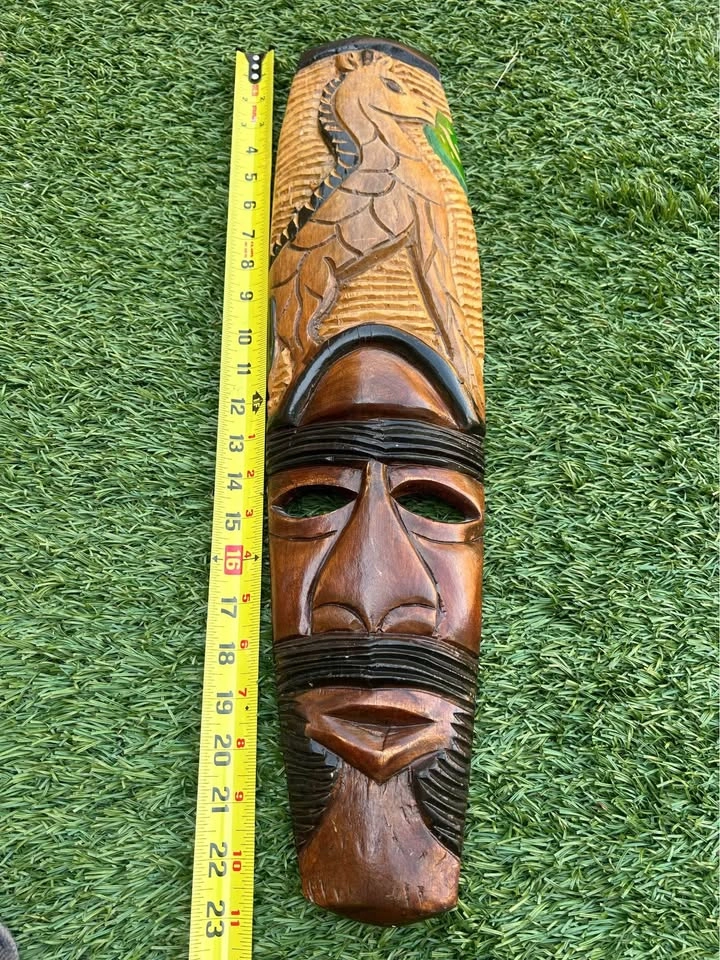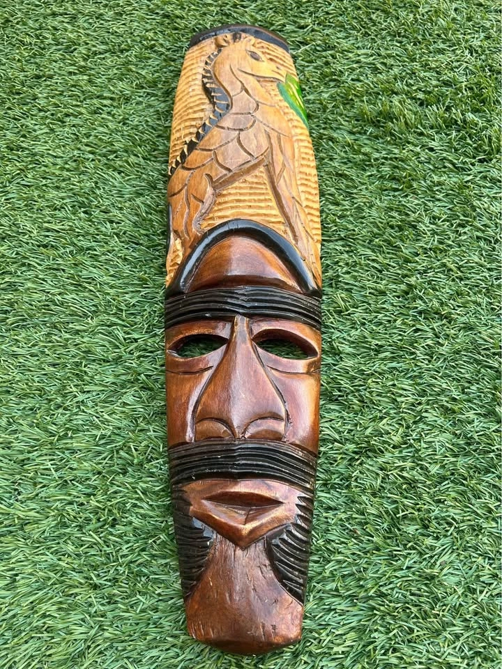 Beautifully hand-carved wooden tribal mask featuring a stylized human face with a finely detailed bird motif at the top. The carving showcases contrasting stained and painted details, adding depth and texture. Measures approximately 22 inches tall. A great decorative piece for bohemian, tribal, or eclectic interiors. Pick up: Seton area, Calgary. See also my other lots. Open to your questions and suggestions. If necessary, I provide additional photos. These are not new things, so please look carefully at the photos and videos. Sizes are submitted on request and also using a tape measure in the photo.