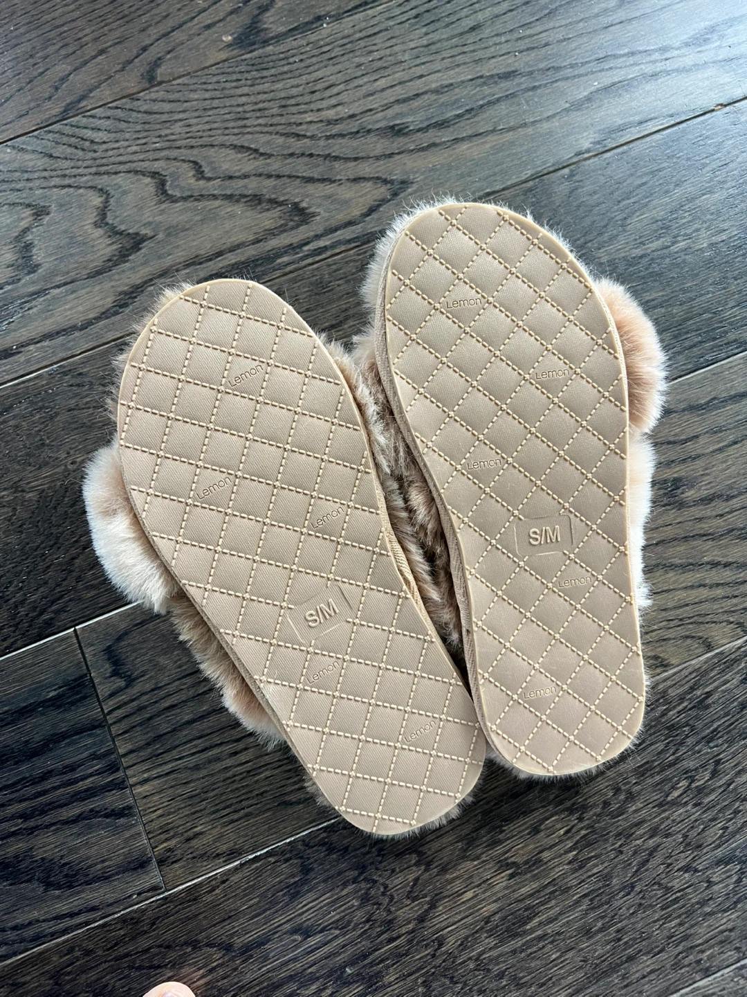 Super comfy and stylish Lemon plush fur slippers! These are in size S/M and are perfect for keeping your feet cozy around the house. They're in great condition and ready for a new home!