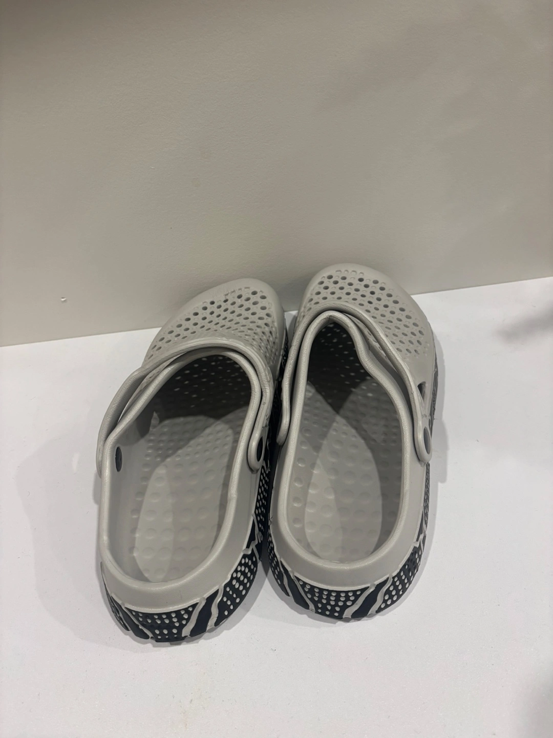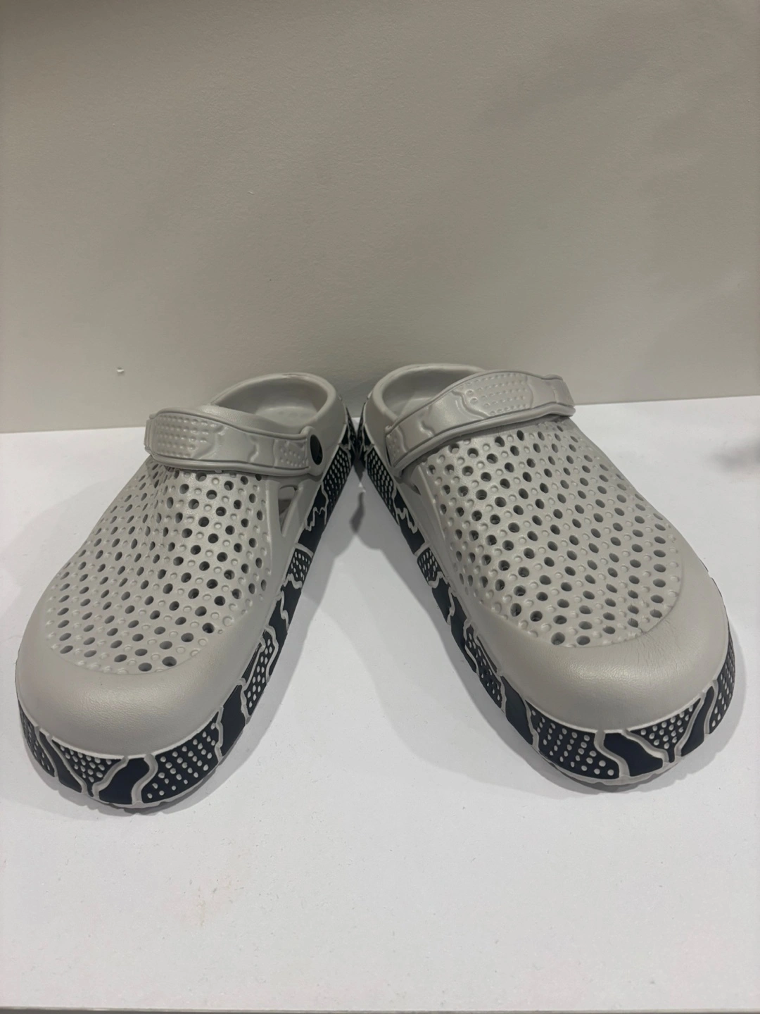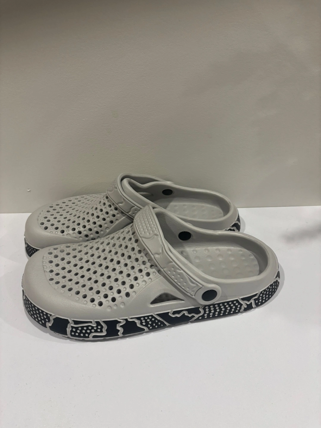 Comfy grey clogs with a fun pattern on the sole! Great for pottering around the house or garden