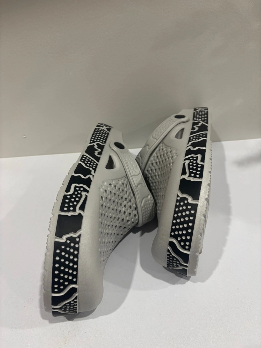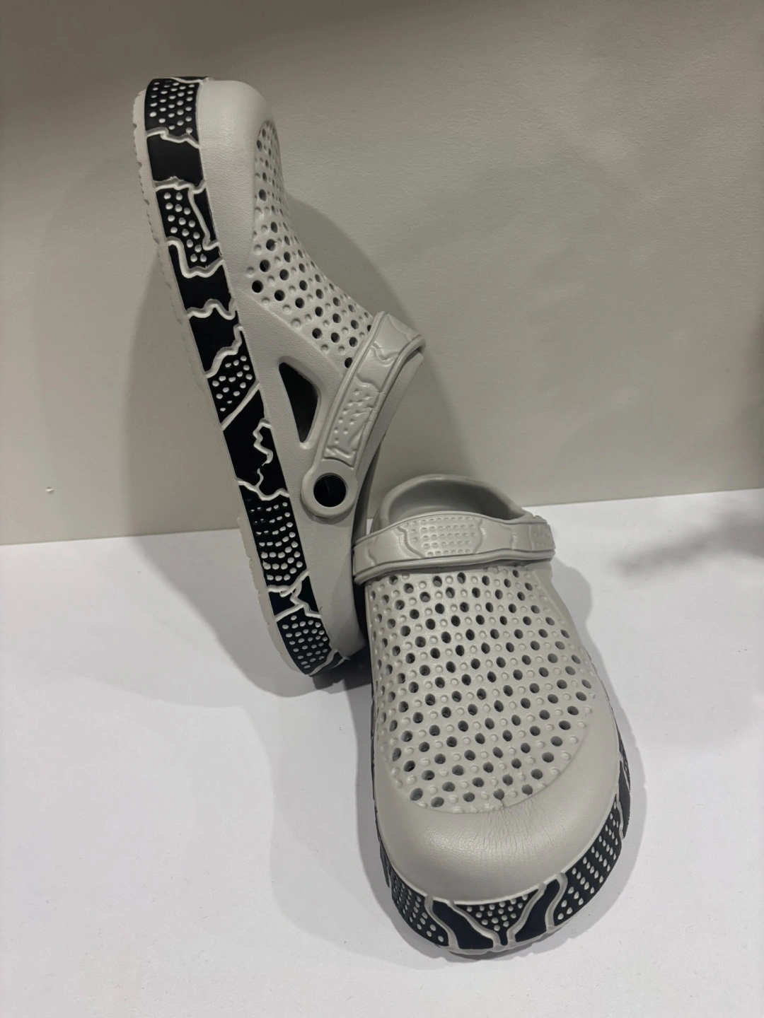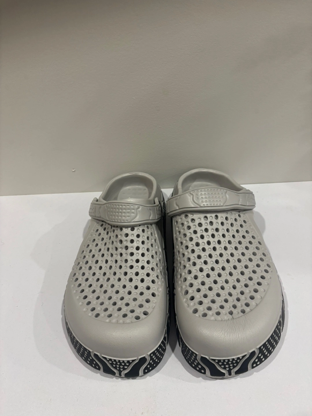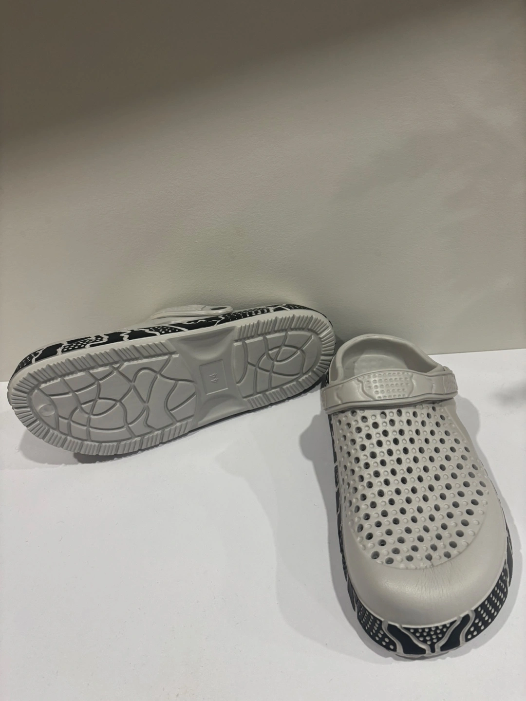 Comfy grey clogs with a fun pattern on the sole! Great for pottering around the house or garden