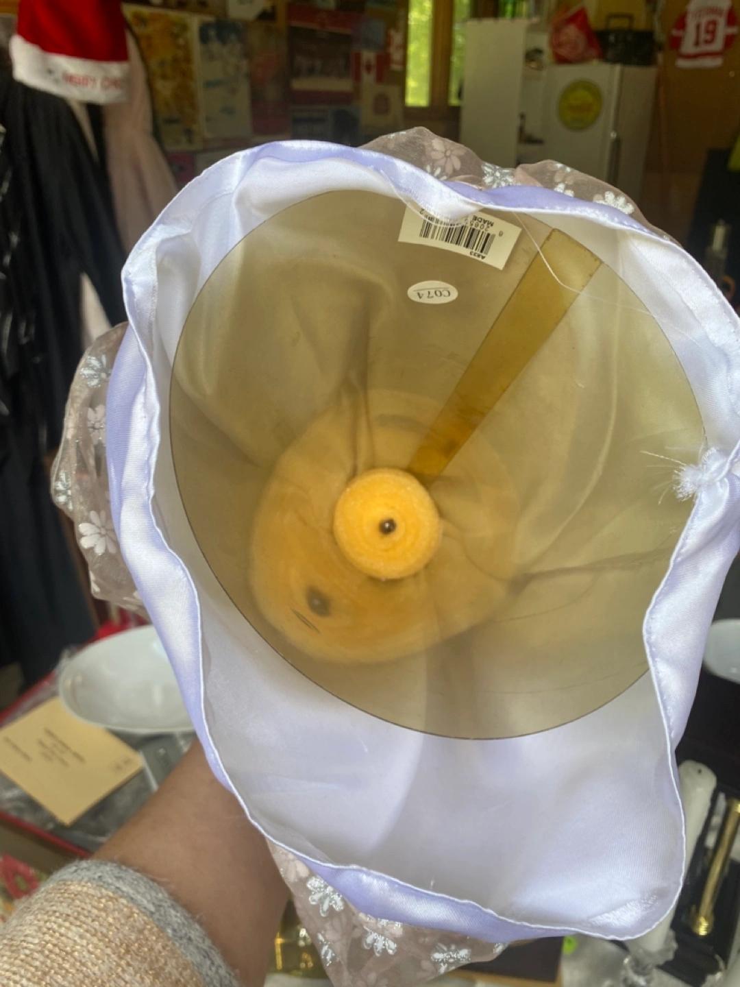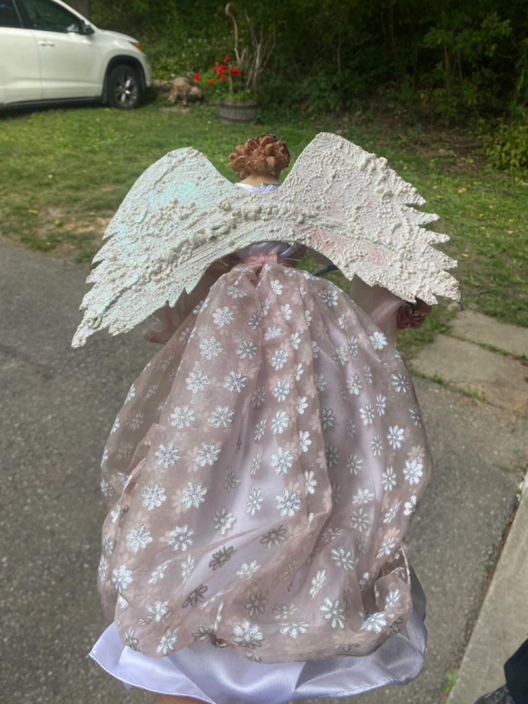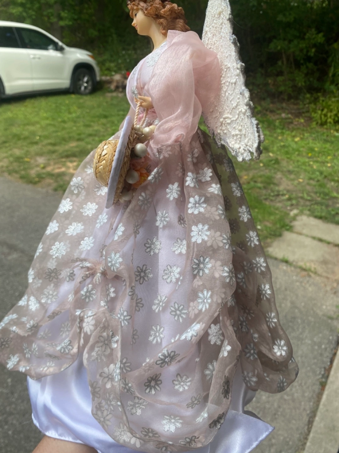 Selling a lovely angel doll with a beautiful pink and white floral dress and sparkly wings! She's holding a cute little hat. Perfect for adding a touch of whimsy to your home decor