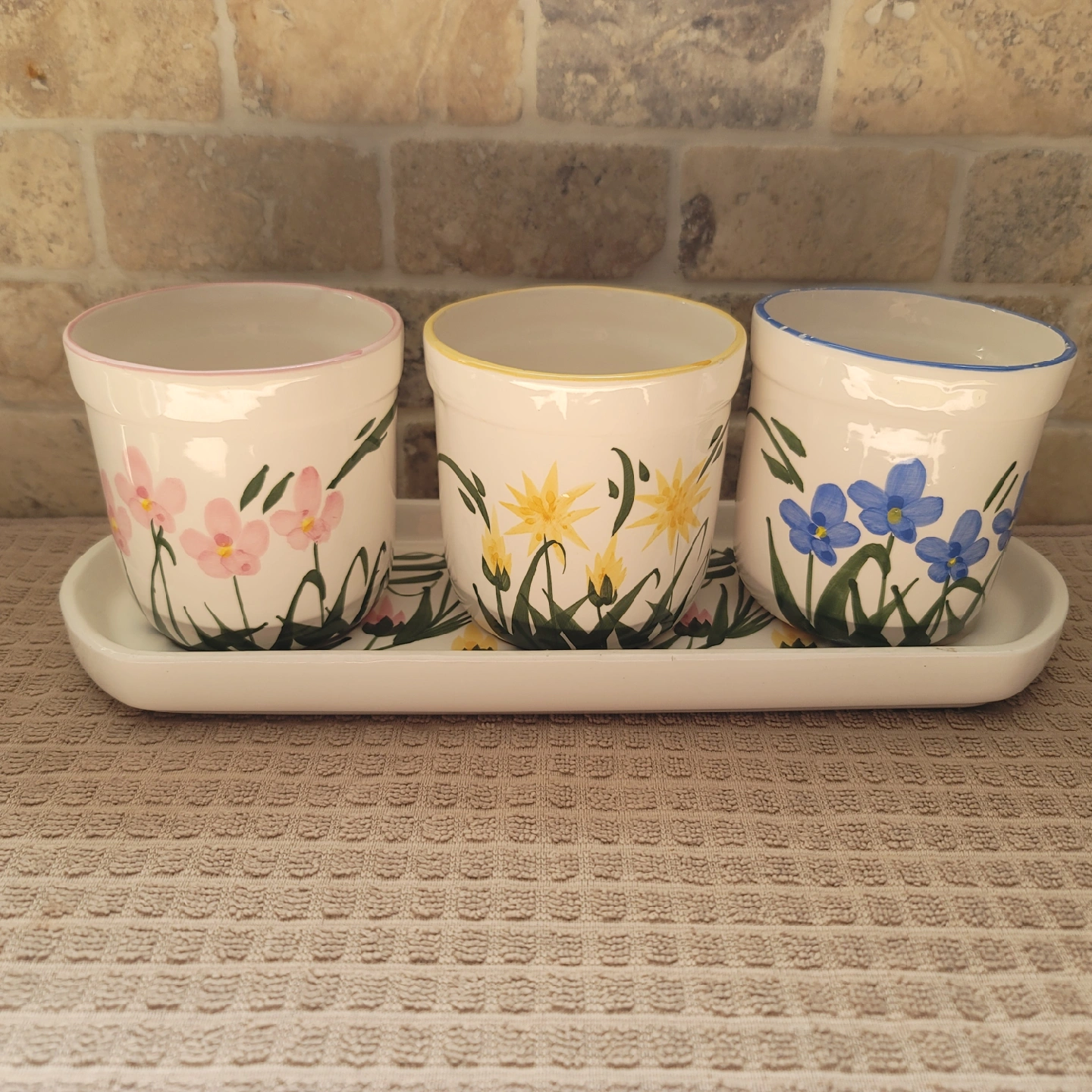 Here are three charming ceramic pots with a matching tray! Each pot features a different floral design: pink, yellow, and blue. Perfect for adding a touch of colour to your home or garden