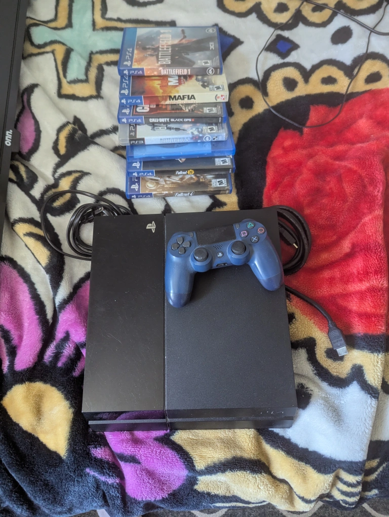 Selling a PlayStation 4 console with a blue controller. Includes several games: Battlefield, Battlefield 1, Mafia, Call of Duty Black Ops, and Fallout 4 - not loud and needs help to insert and remove discs but still everything works. pick up.