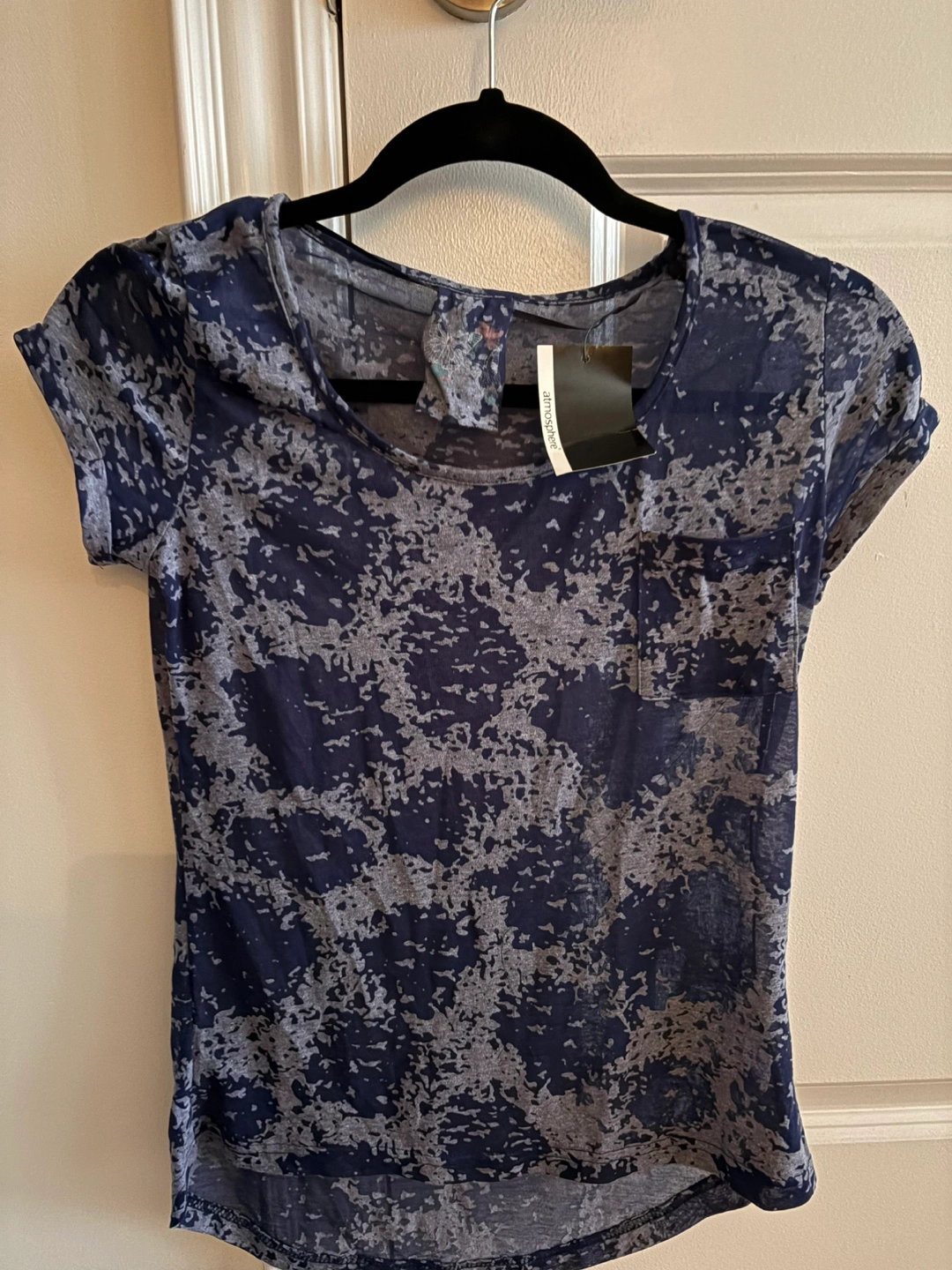 Selling a cute Atmosphere t-shirt featuring a blue and grey pattern - sheer but looks great with a cute tube bra or cami. Size appears to be xsmall to small