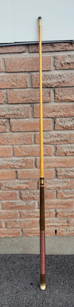Selling a billiard/pool cue stick. It has a brown and tan design with a wrapped grip.