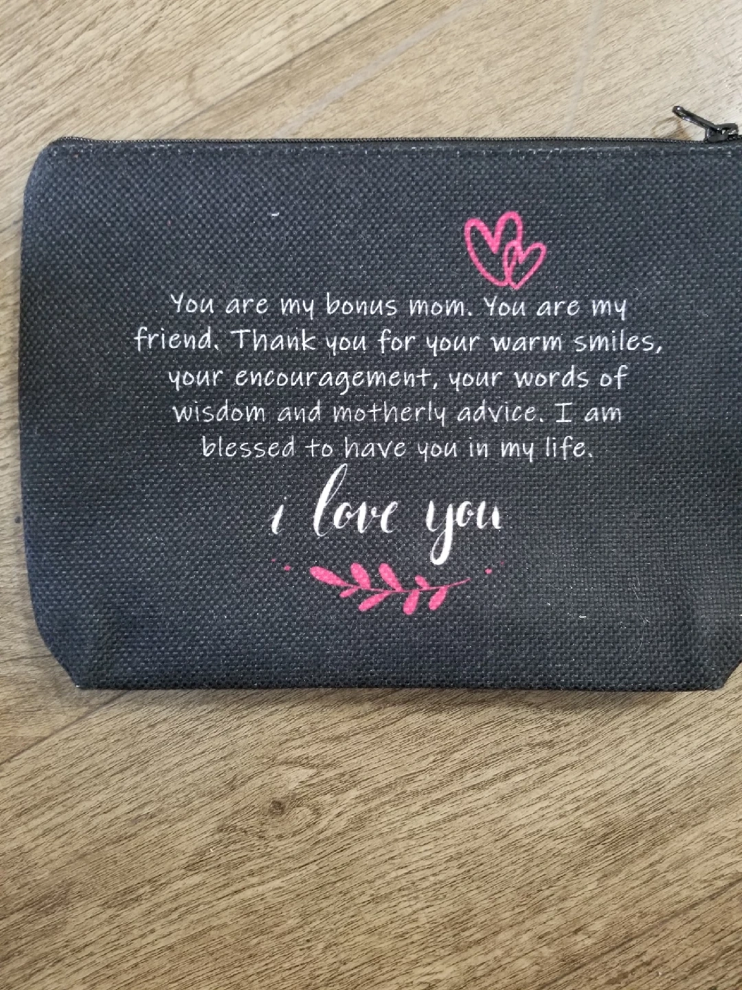 A cute zippered pouch with a heartfelt message: "You are my bonus mom. You are my friend. Thank you for your warm smiles, your encouragement, your words of wisdom and motherly advice. I am blessed to have you in my life. I love you" Brand new