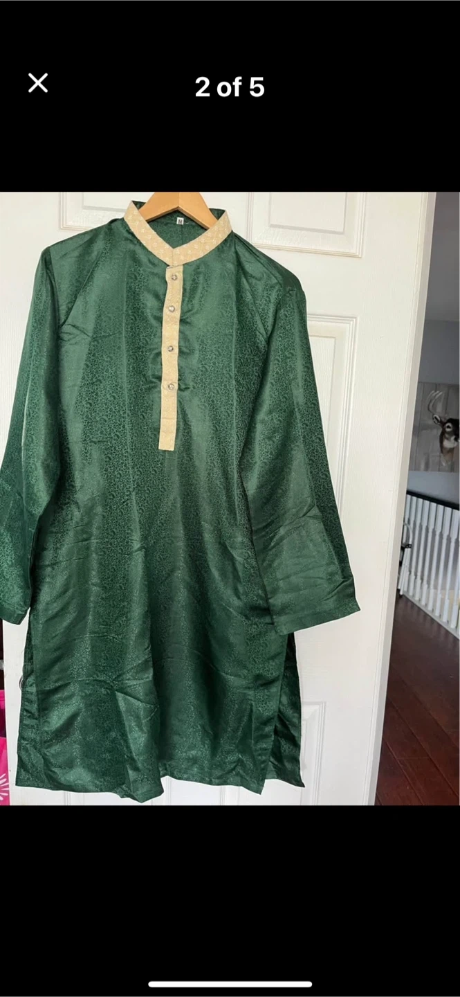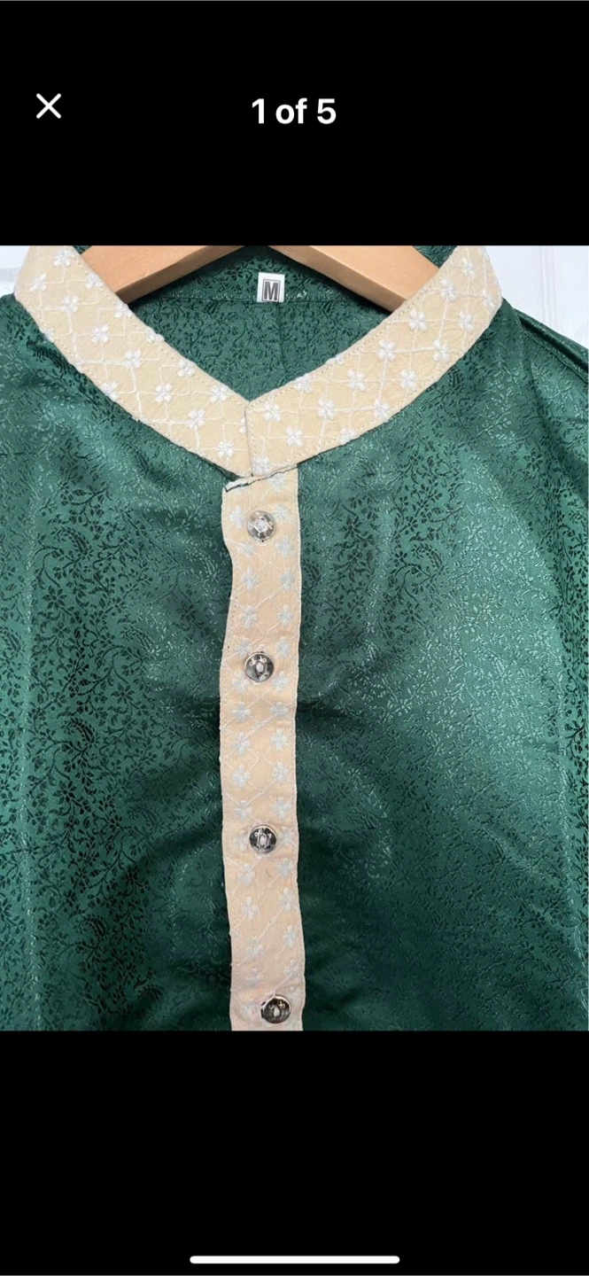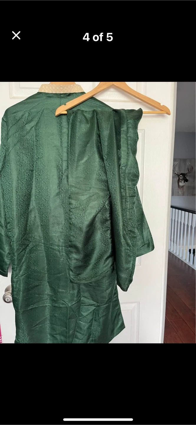 Only worn a few hours green kurta set in size M. This traditional outfit is perfect for special occasions. The fabric has a subtle pattern, and the set includes both the kurta and pajama pants. It's in great condition and ready for a new home!