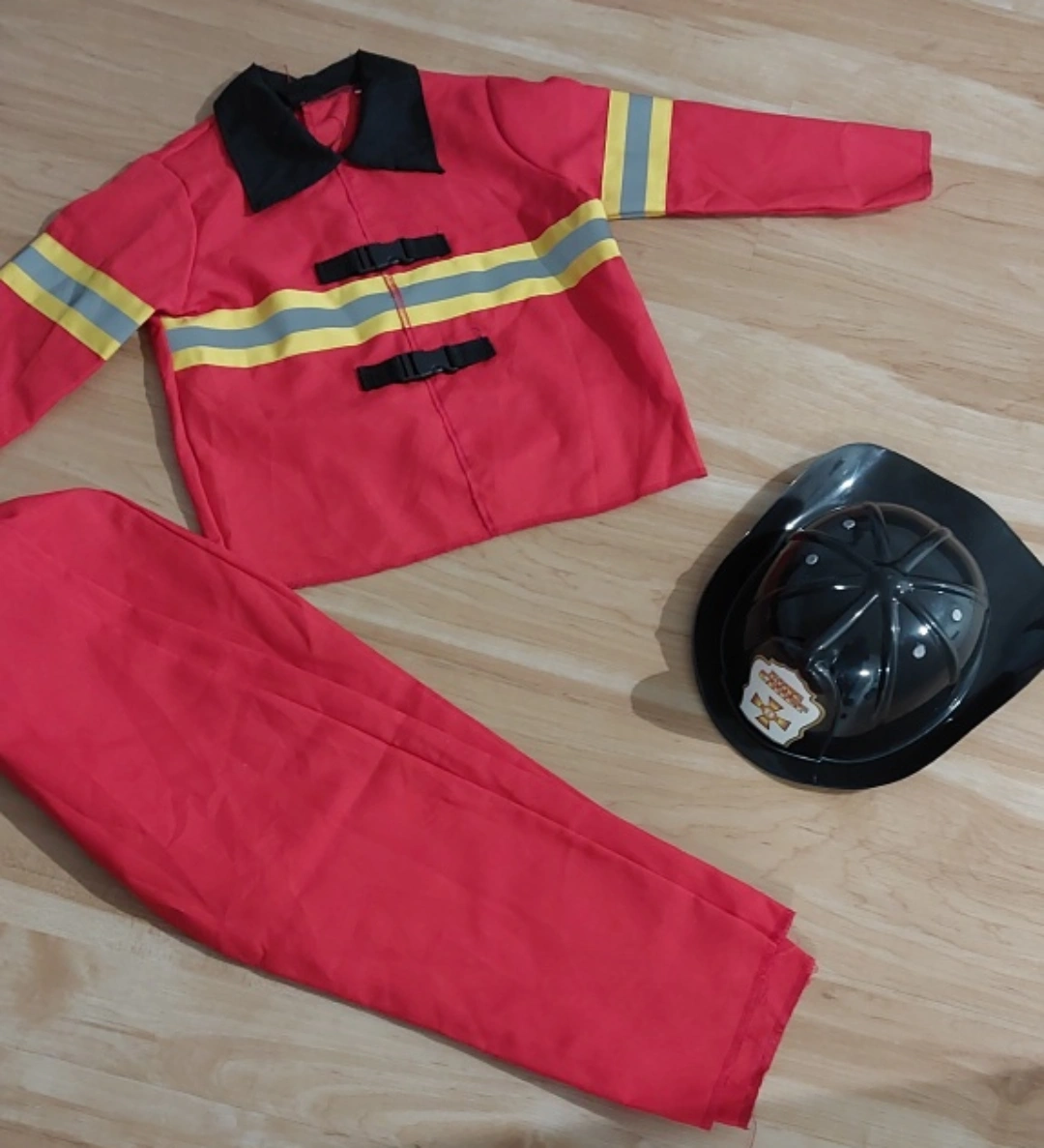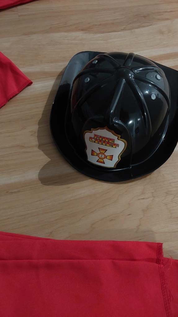 Fire fighter costume set, perfect for dress-up or Halloween! Includes a red jacket, pants, and a black helmet with a "Fire Chief" emblem. Great for kids who love playing pretend