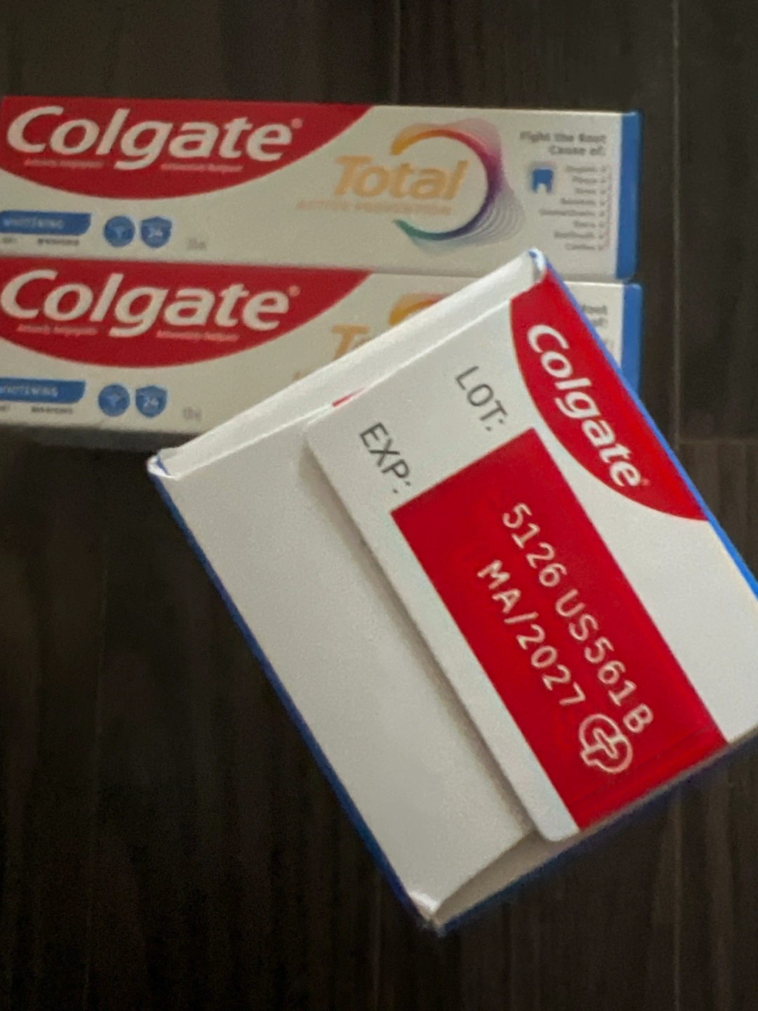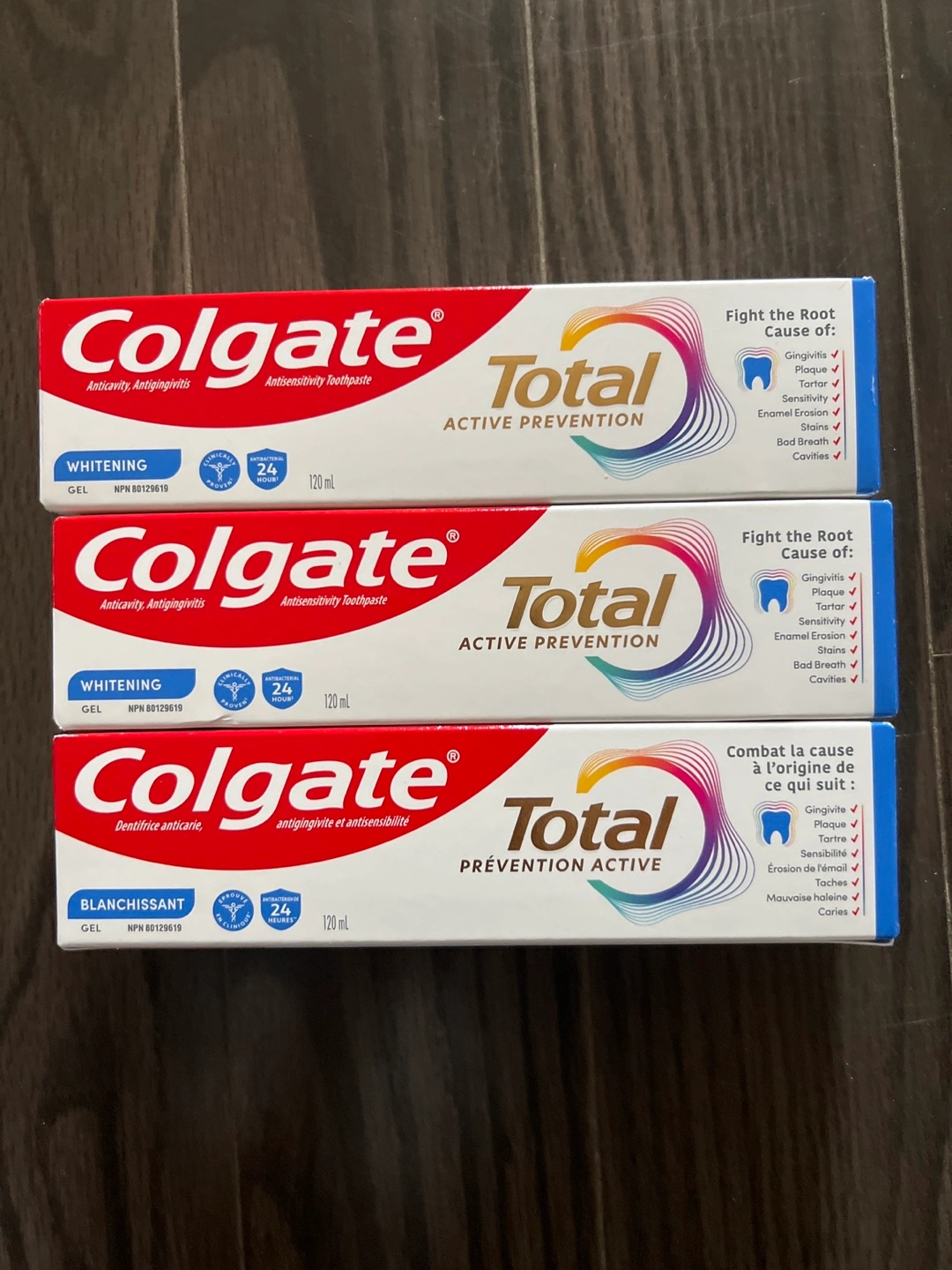 Selling three tubes of Colgate Total Active Prevention Whitening toothpaste Each tube contains 120ml of gel toothpaste, perfect for fighting gingivitis, plaque, tartar, enamel erosion, stains, bad breath, and cavities The expiration date is MA/2027 $2 each