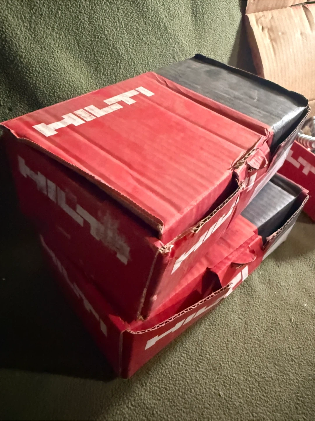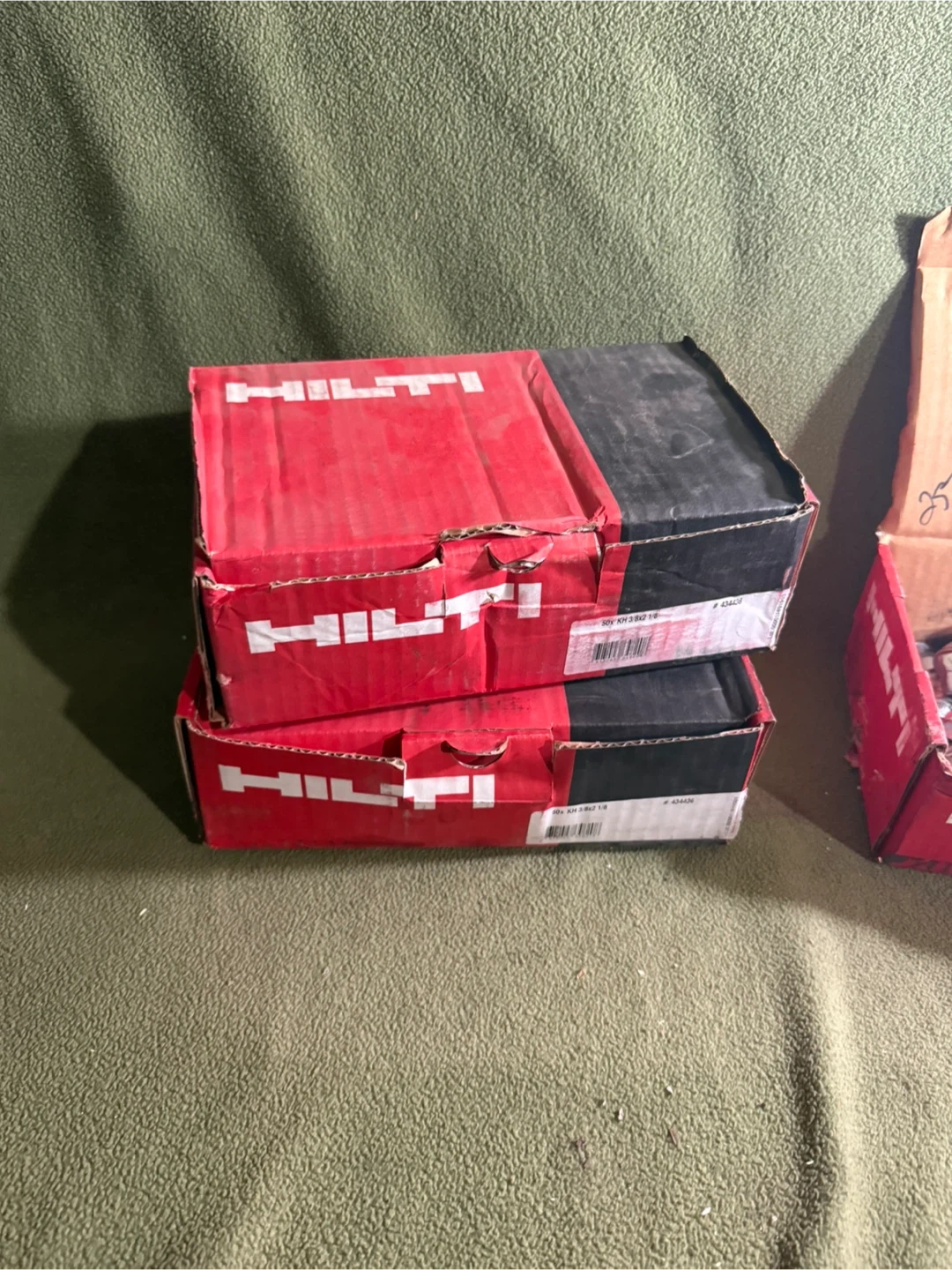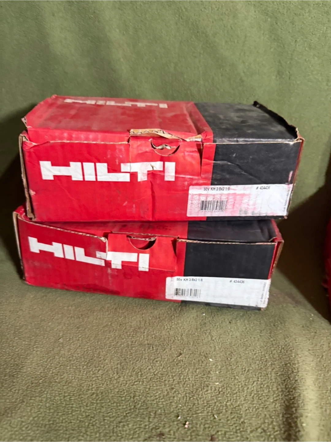 I am selling two boxes of used Hilti KH-EZ 3/8" x 2-1/8" screw anchors, #418056. Perfect for various fastening applications, these anchors offer reliable performance. ♦️100pcs new in box * **Type:** Screw Anchor * **Size:** 3/8" x 2-1/8" * **Model Number:** KH-EZ 3/8" x 2-1/8" #418056 ♦️25pcs new in box * ** Type.** Screw Anchor * ** Size.** 1/2” x3” * ** Model number** KH-EZ 1/2” x2” #434441 ♦️15pcs new in box * ** Type** Screw Anchor * **Size** 3/8” x 3 1/3” * ** Model number KH-EZ 3/8” x 3 1/3” #434??? Given the going rates for similar items on Karrot, I'm asking $200 for them all 3 size all for boxes together 140 anchors total Don't miss out on this fantastic deal! And yes, since you're wondering, if the ad is up, they're still available!