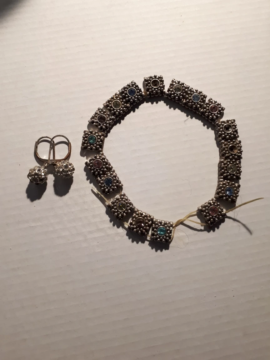 Selling a cute vintage bracelet and earring set! The bracelet features silver-tone square beads with colourful gem-like accents. The earrings are matching silver-tone studs. Perfect for adding a touch of sparkle to any outfit!