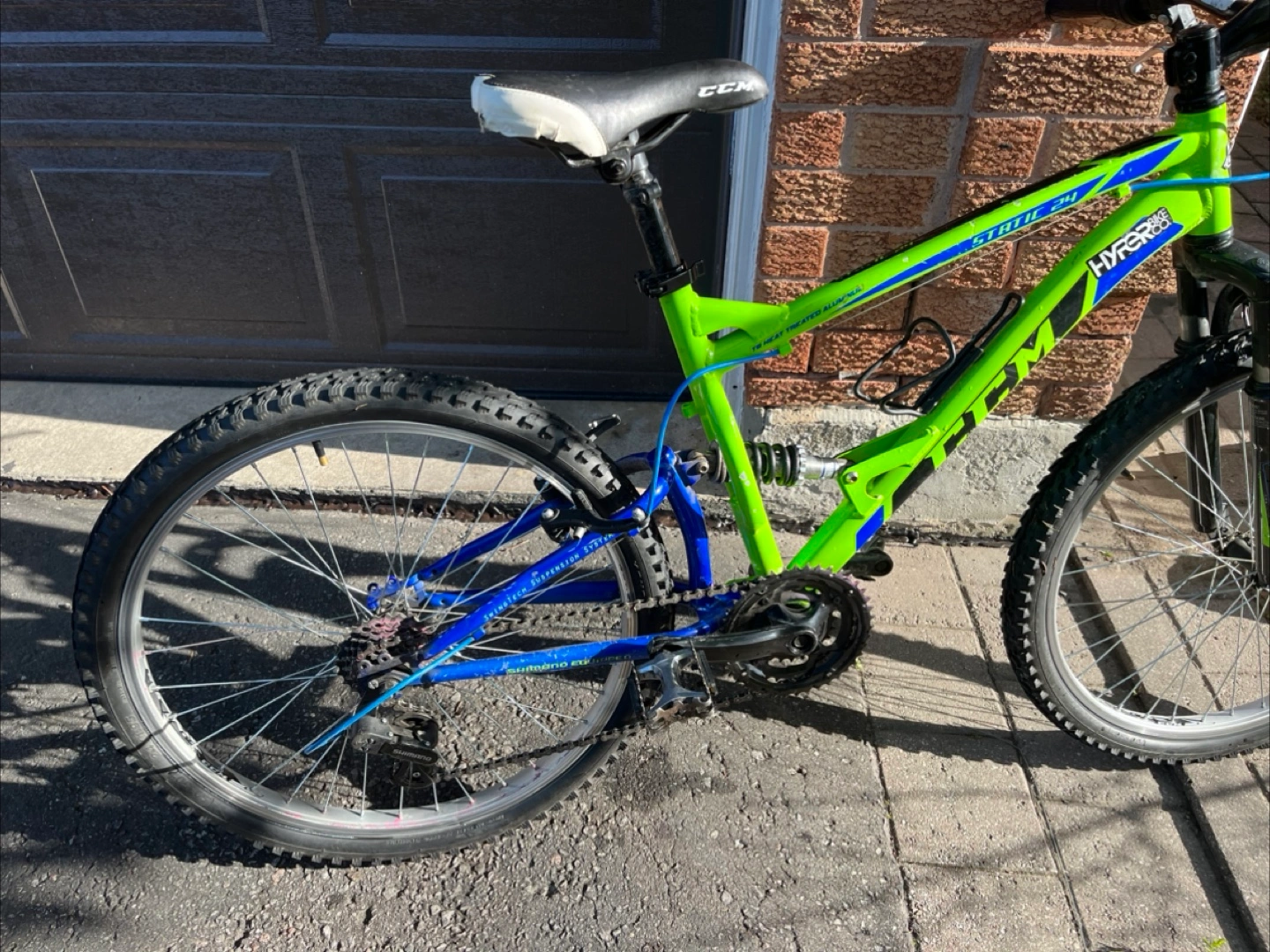Pick up from Maple Vaughan. Major intersection keele and Rutherford. New tires Selling a CCM Static 24" mountain bike in a vibrant green and blue colour scheme. It's a great bike for hitting the trails or just cruising around the neighbourhood. The tires are 24 x 1.95. Ready for a new home!