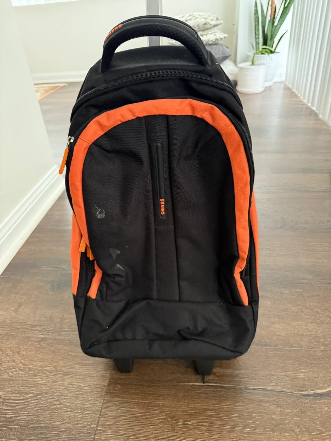 - Canvas rolling backpack - black and orange - good for travel or school. - retractable handle and wheels for easy transport - backpack straps if you prefer to carry it - good condition, never used