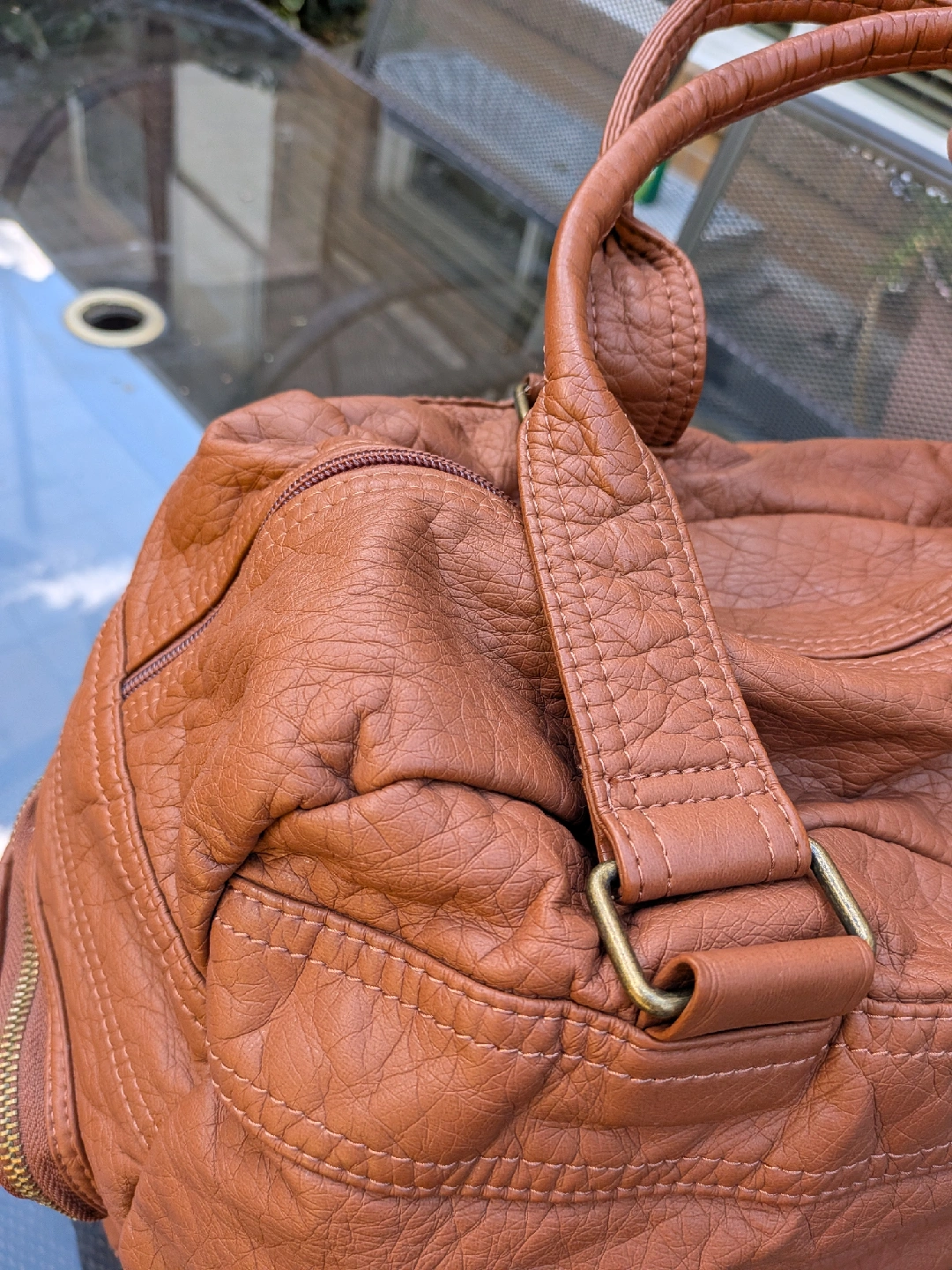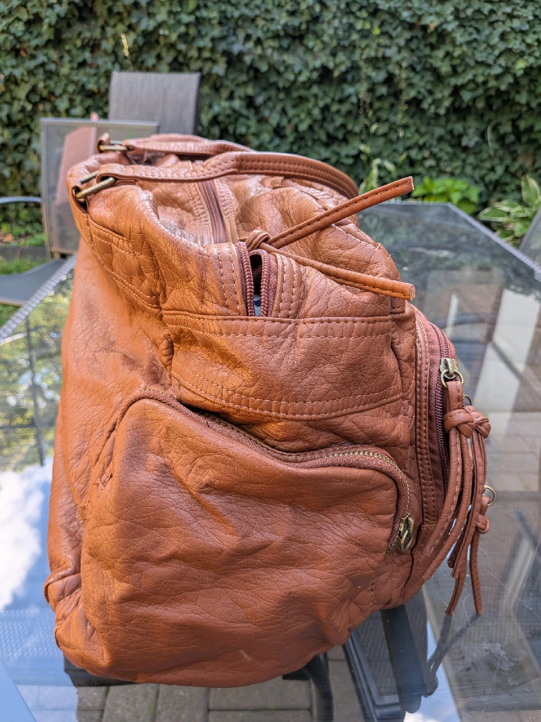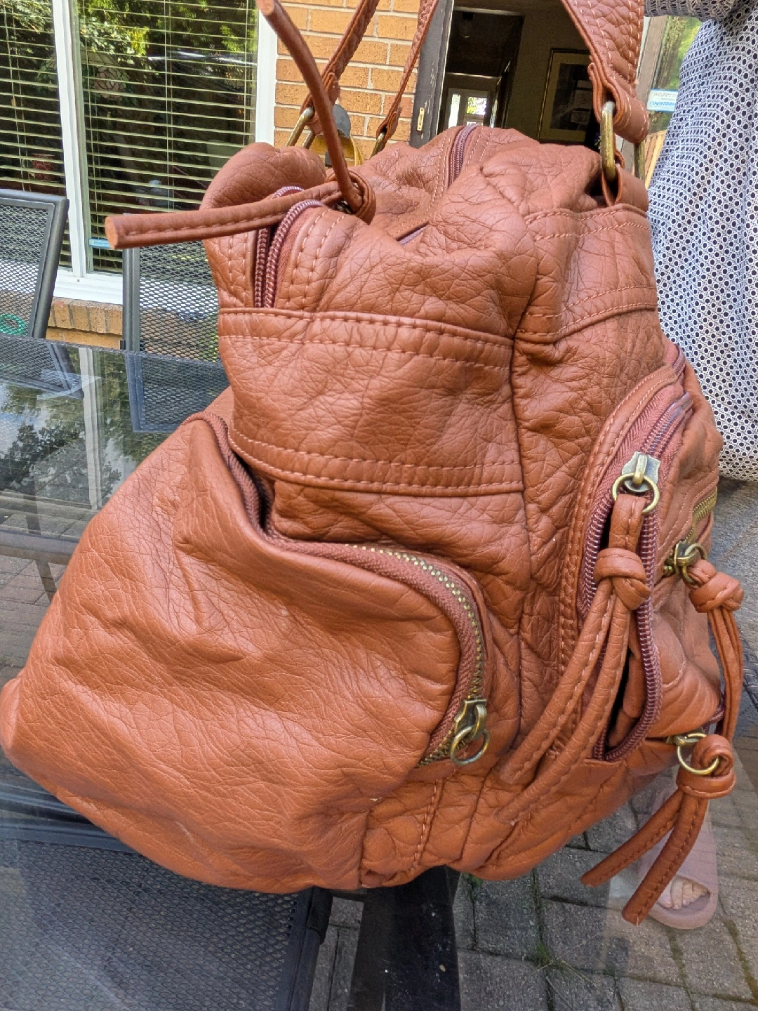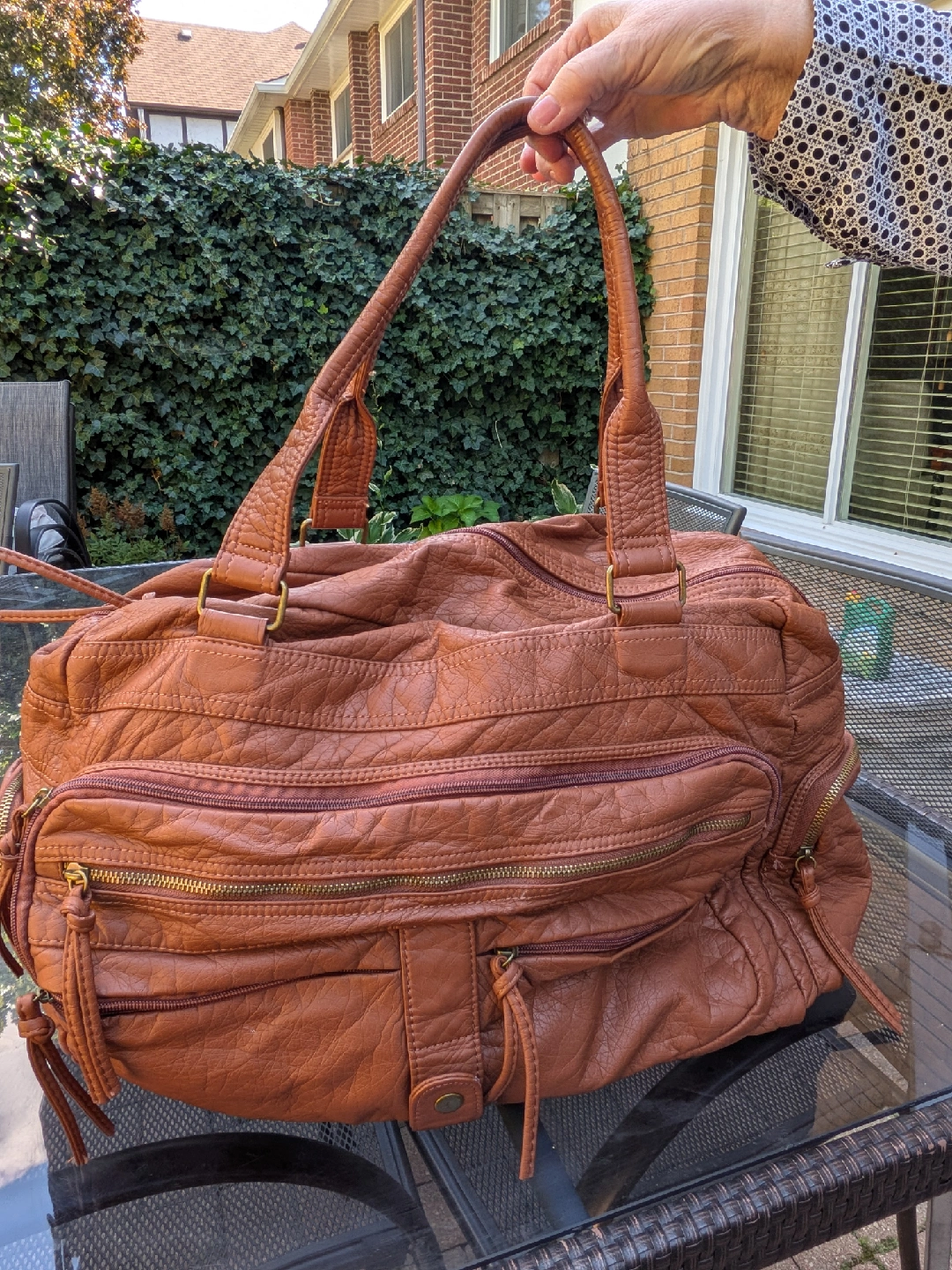 Selling a brown carry on duffle bag. It could be leather, not 100% sure. It certainly feels and looks like leather. It has lots of pockets and a unique design Light brown colour with orange tinge, nice Autumn colour Preowned but pretty good condition with no holes, no tears, no odours, and clean Cash only, no etransfers *** Location: Etobicoke, near Etobicoke Olympium. Main intersection is Rathburn and Renforth** First come, first serve, No holds