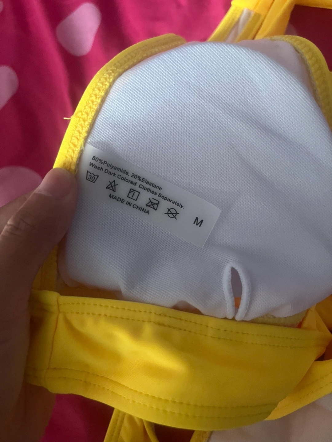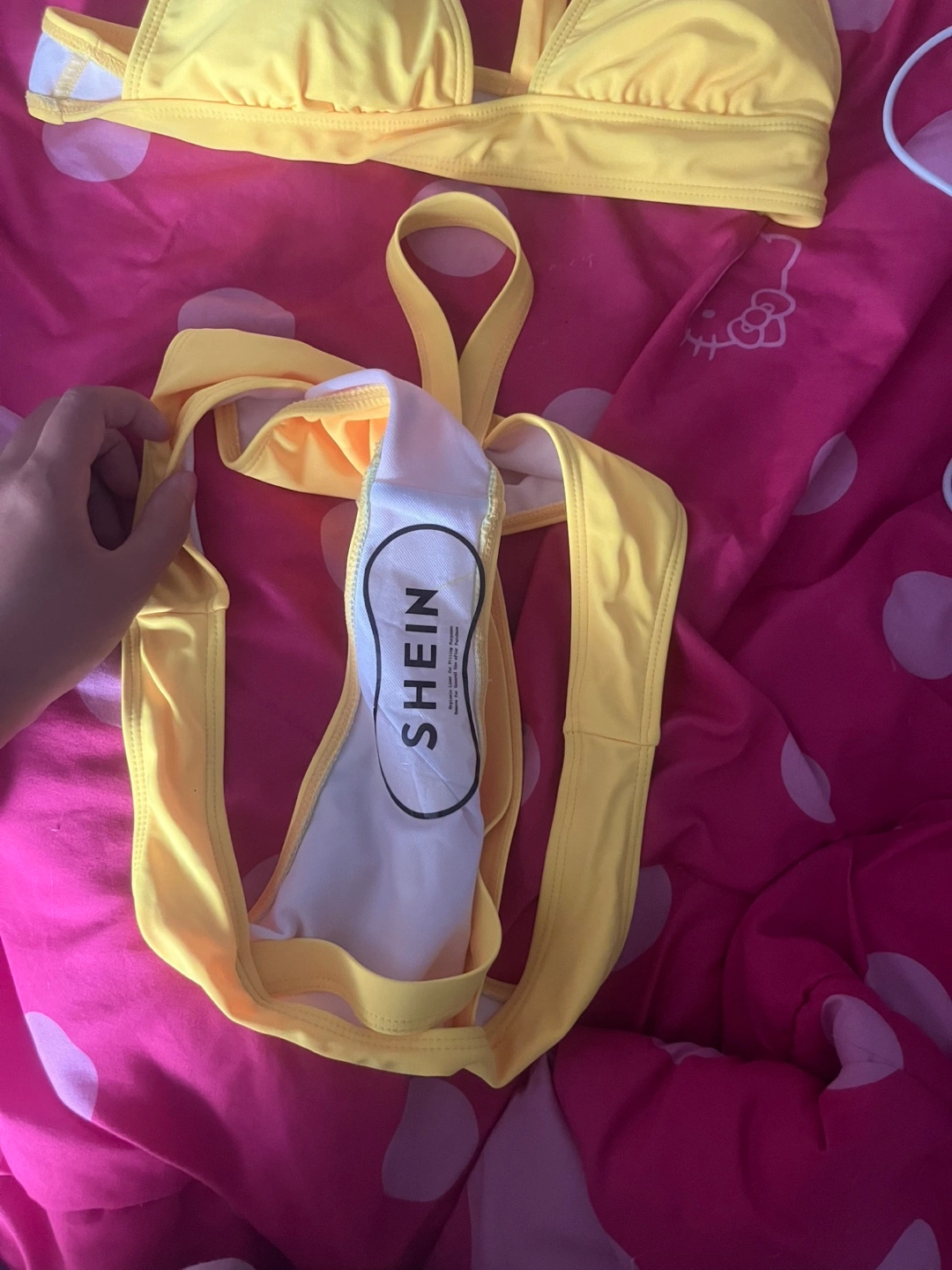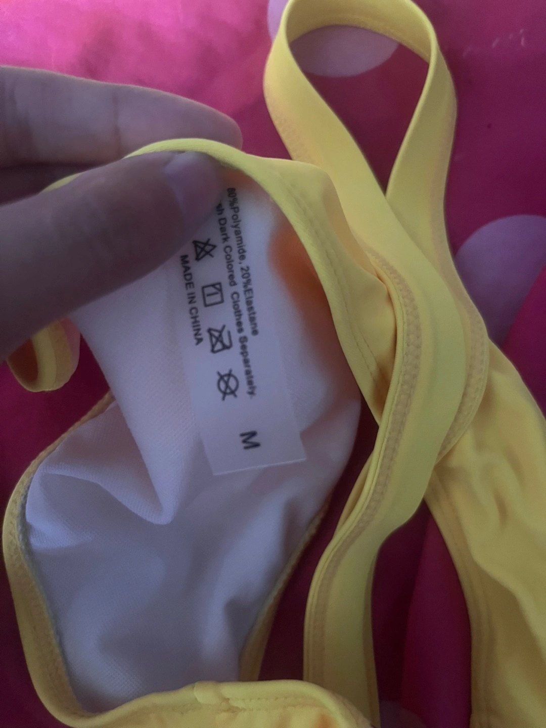 Selling a cute yellow bikini from Shein! It's a size medium and made of 80% polyamide and 20% elastane. Just a heads up, you'll want to wash dark coloured clothes separately
