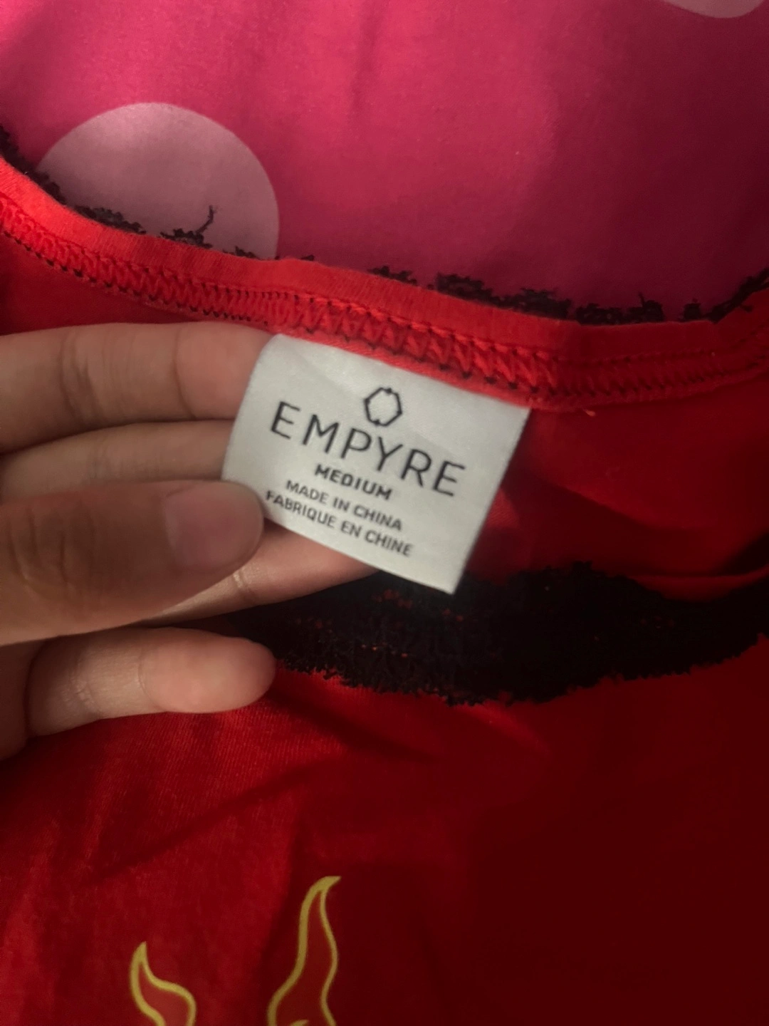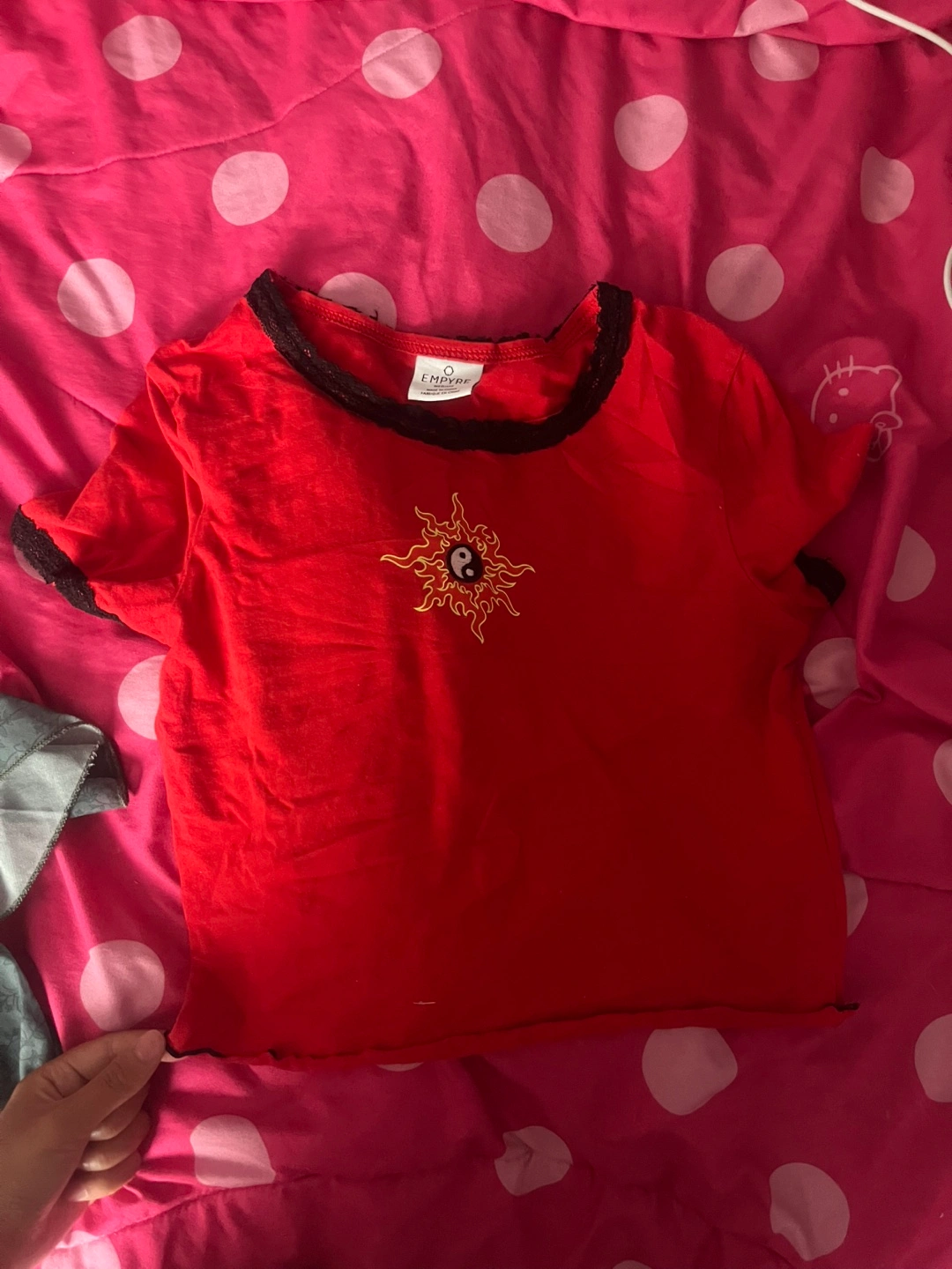 Selling a cute red crop top from Empyre! It's a size medium and has a cool design on the front. The top is in great condition and ready for a new home