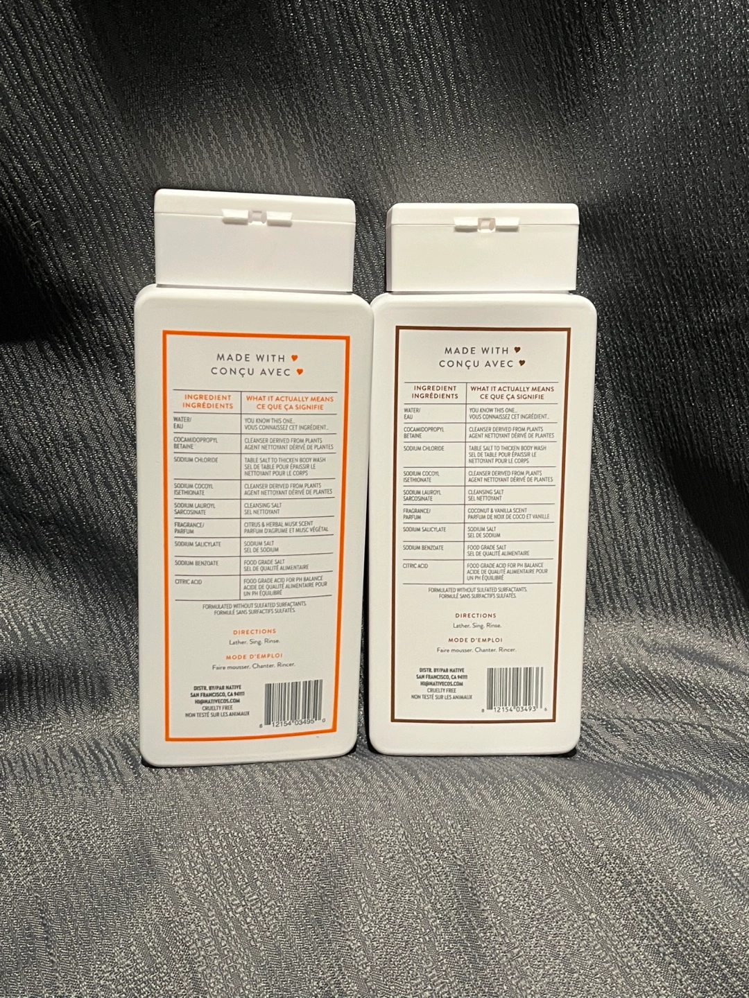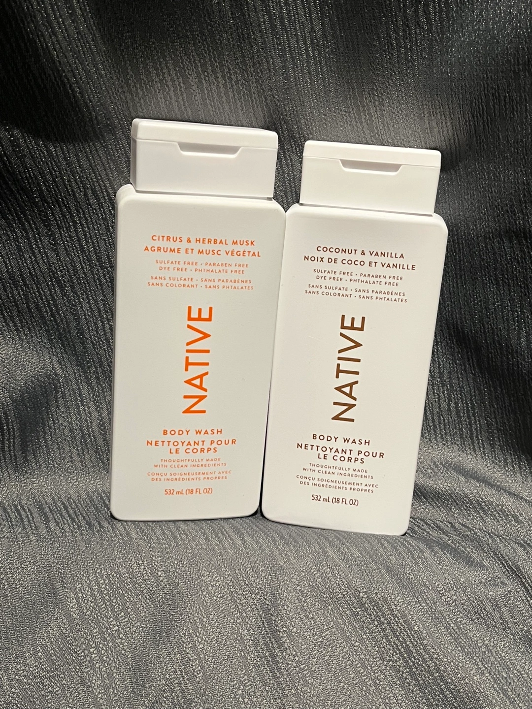 Selling a set of two Native body washes. One is Citrus & Herbal Musk, and the other is Coconut & Vanilla. Each bottle contains 532 ml (18 fl oz). They are sulfate-free, paraben-free, and dye-free. Perfect for a refreshing and thoughtfully made shower experience!