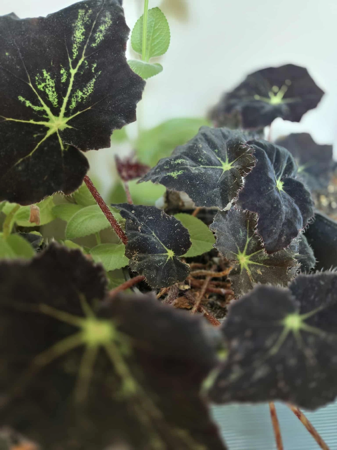 Selling a begonia plant with dark leaves and light green veins. This plant would be a beautiful addition to any home!