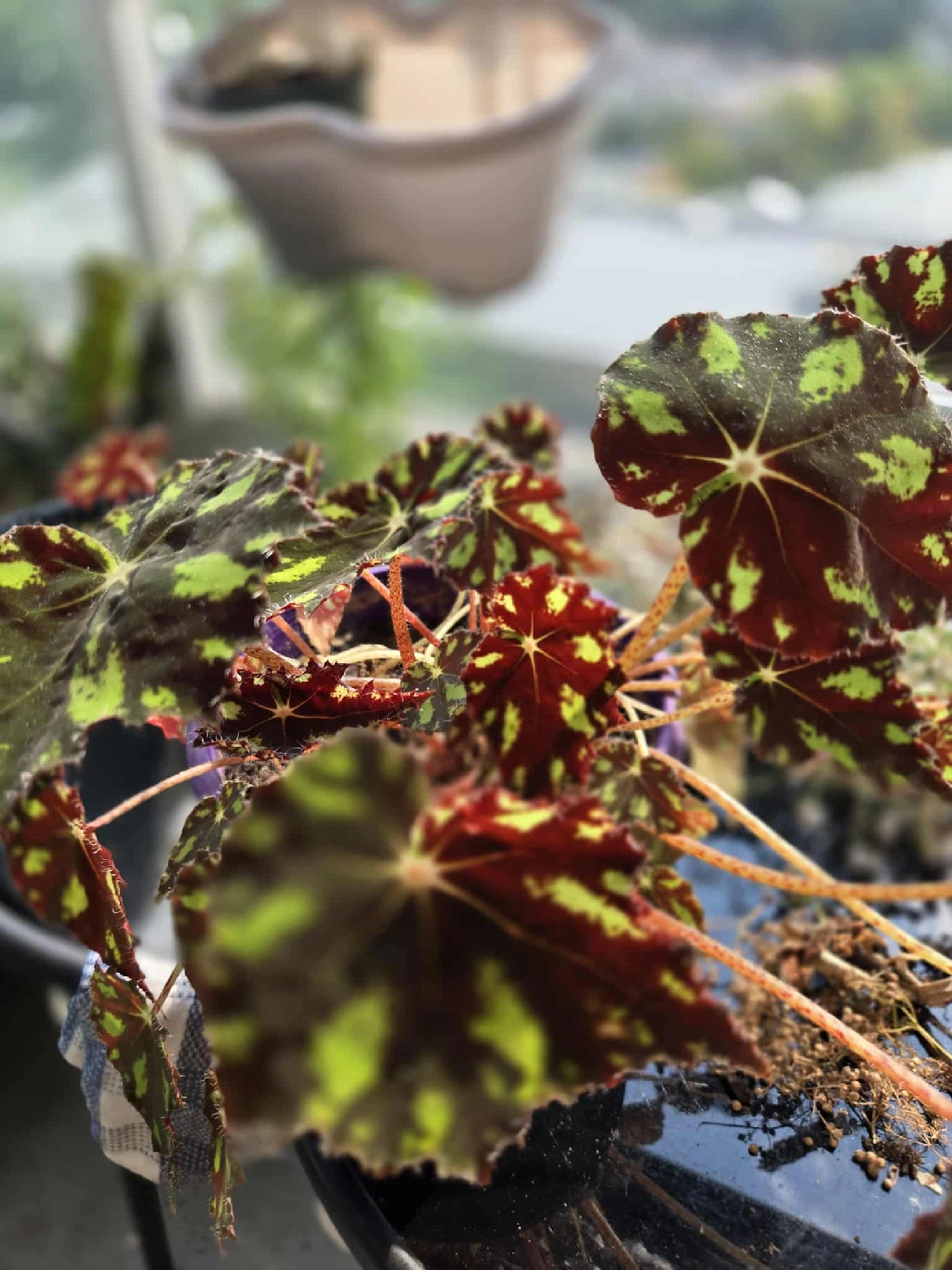 Selling a lovely Begonia plant! It has beautiful leaves with a unique pattern of red, brown, and green. Perfect for adding a touch of nature to your home
