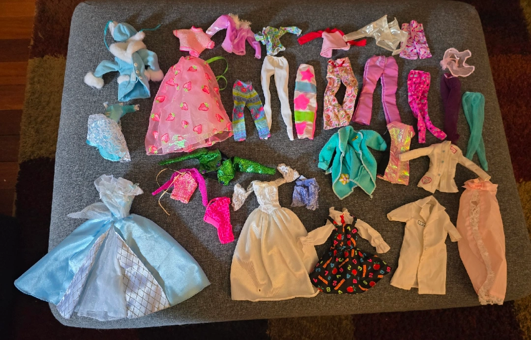 Selling a Barbie fashion doll trunk that comes with a variety of doll clothes! Perfect for any Barbie enthusiast or collector. The trunk is in good condition and the clothes are ready for new adventures