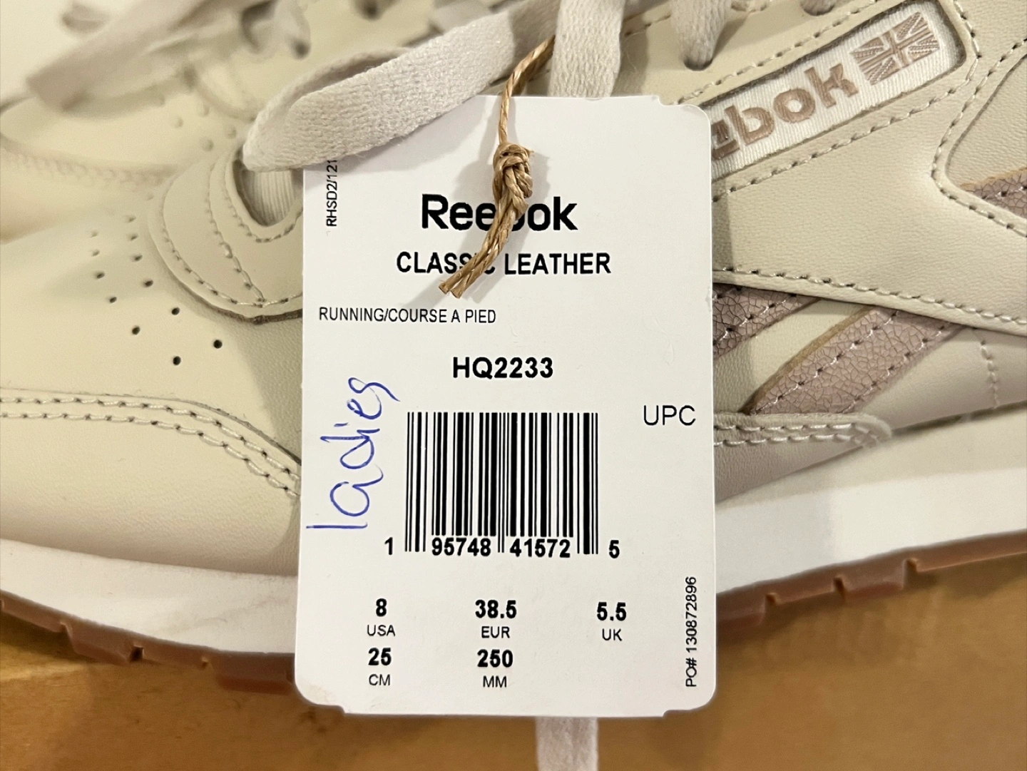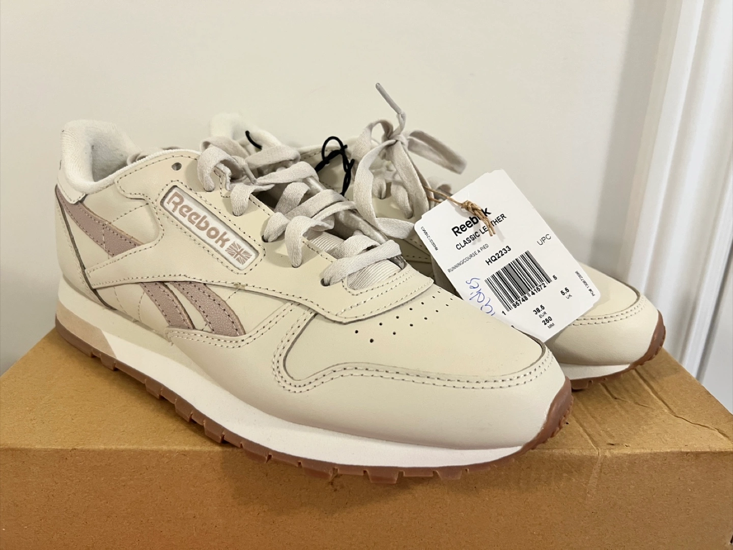 These Reebok Classic Leather shoes are brand new and ready for a new home! They are a women's size 8. The colour is a lovely neutral tone, perfect for everyday wear. These shoes are super stylish and comfortable! HQ2233