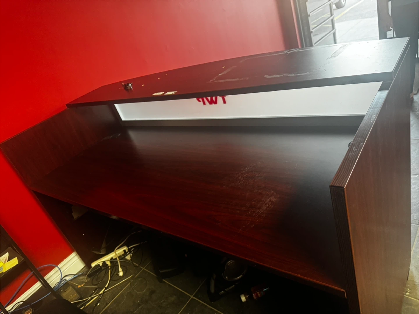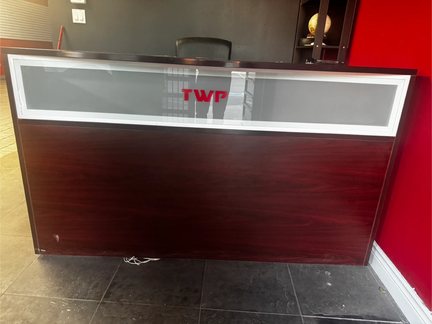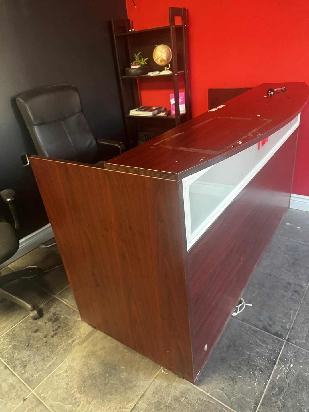 Selling a reception desk, perfect for an office or business space. It features a wood-like finish and a front panel. It's in good condition and ready for a new home/office