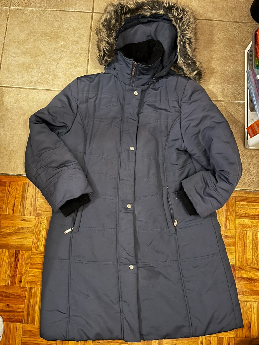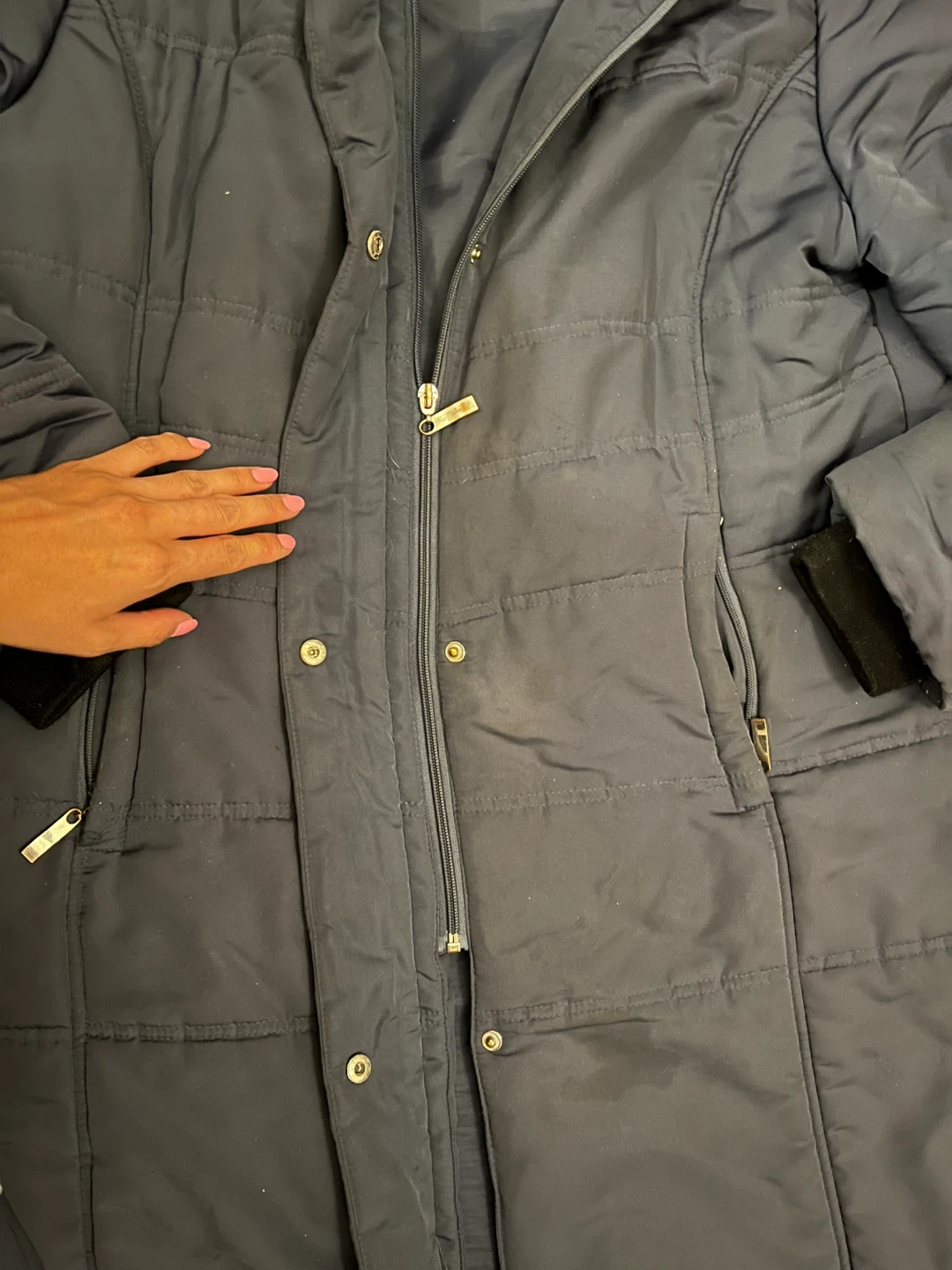 🤍size 14. 🤍polyester filled 🤍It's a lovely blue colour and has a removable faux fur hood. 🤍in good condition, no issues Pick up only Cash only