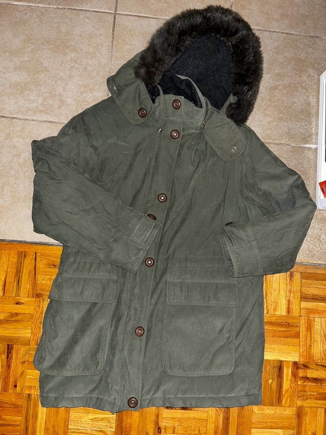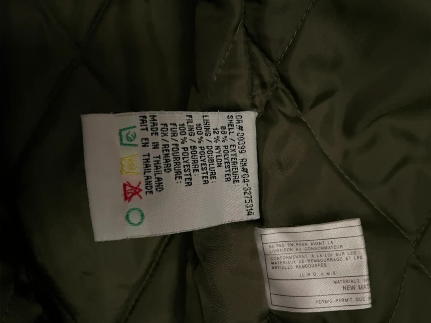 Selling a Sequence winter parka in size M. It's a stylish olive-green colour with a fur-trimmed hood. The outer shell is 66% polyester and 34% nylon, with a 100% polyester lining. The fur is 100% fox. Perfect for staying warm this winter!