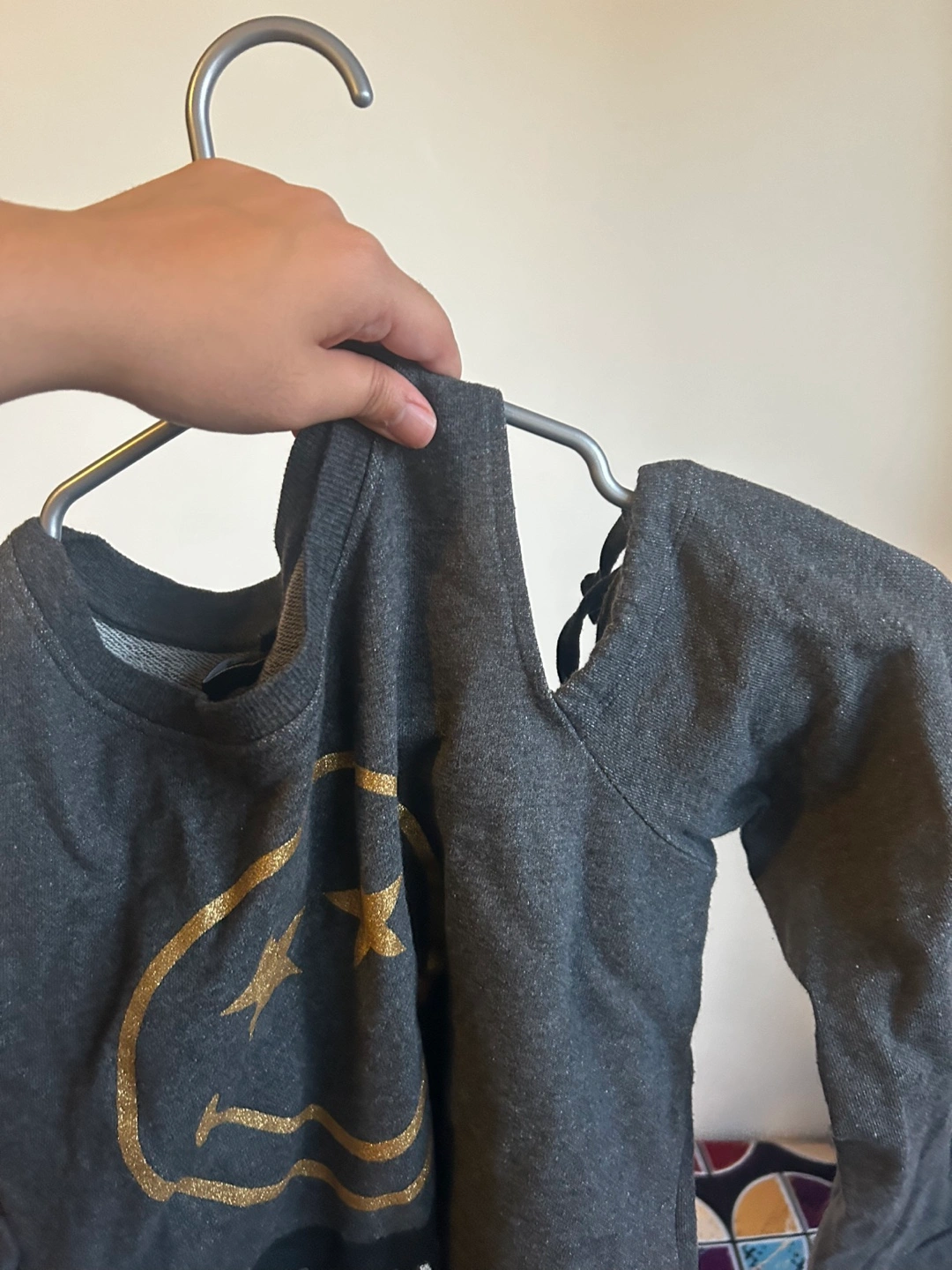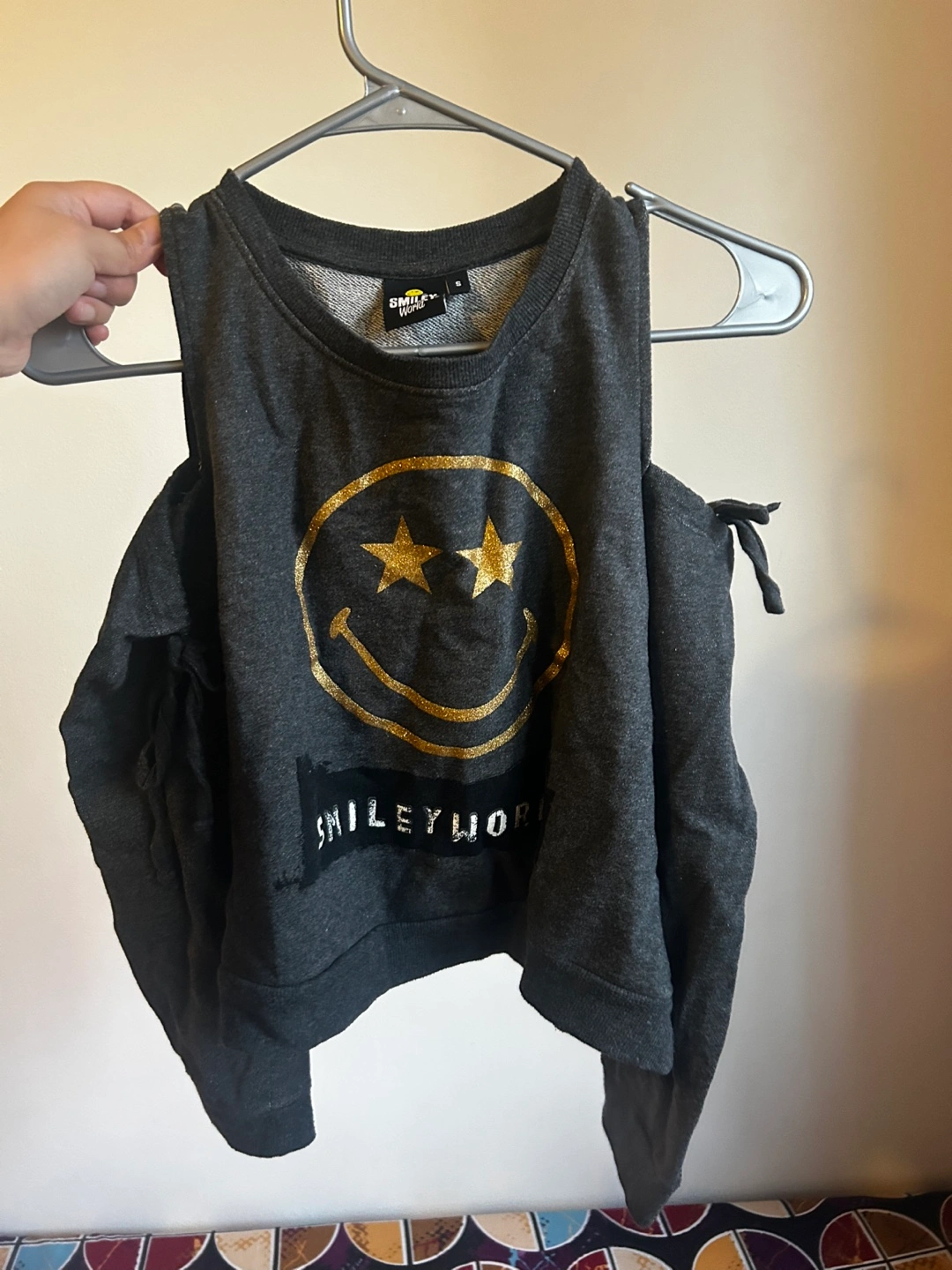 Cute Smiley World sweater in size medium! It's a grey cold shoulder style with a sparkly gold smiley face design. Perfect for adding a bit of fun to your wardrobe