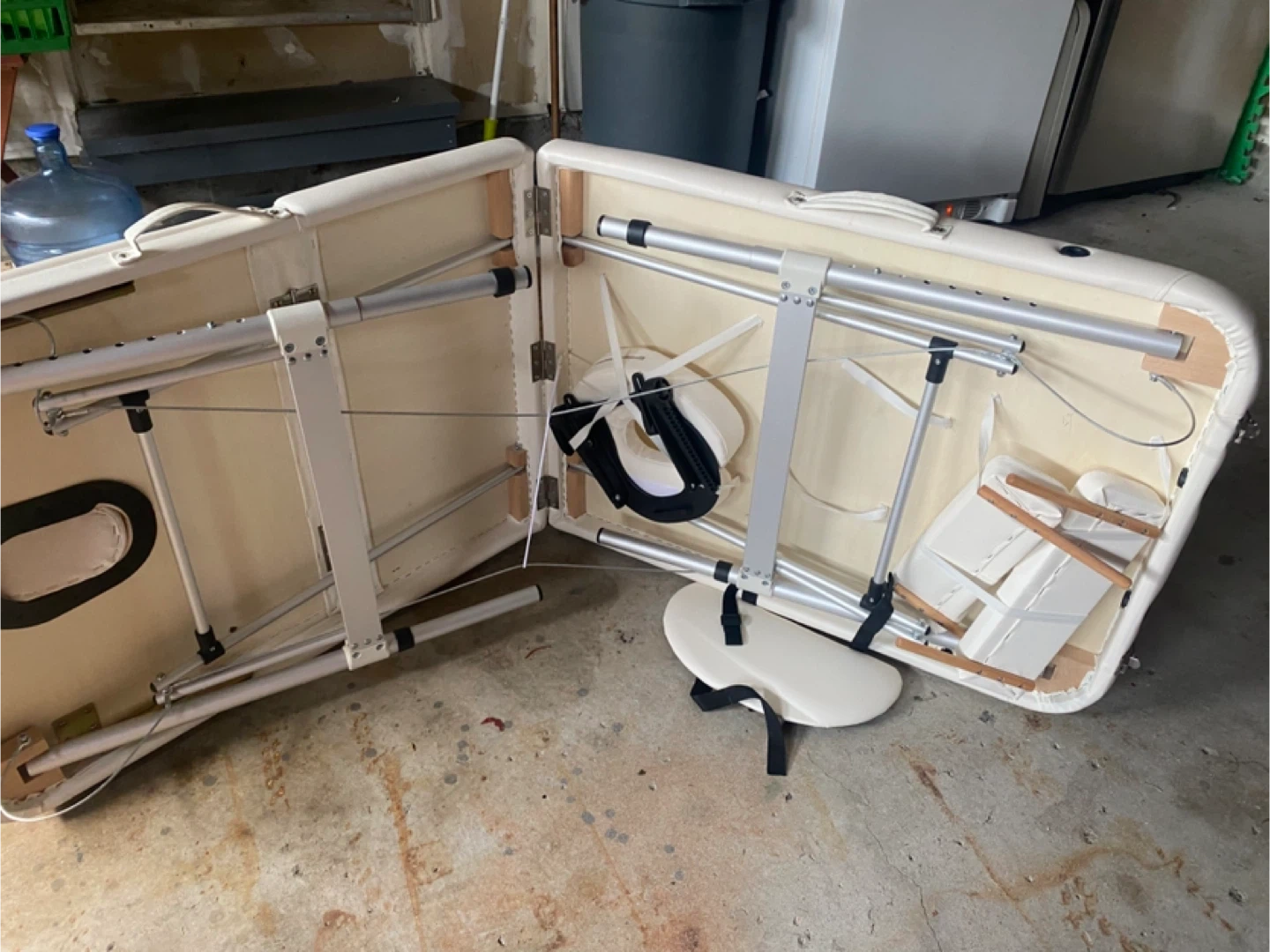 Great condition. No tears, accessories included, with head supports. small colour stain (very faded) from jeans on side of table. Otherwise perfect. Very light to carry. Metal Frame