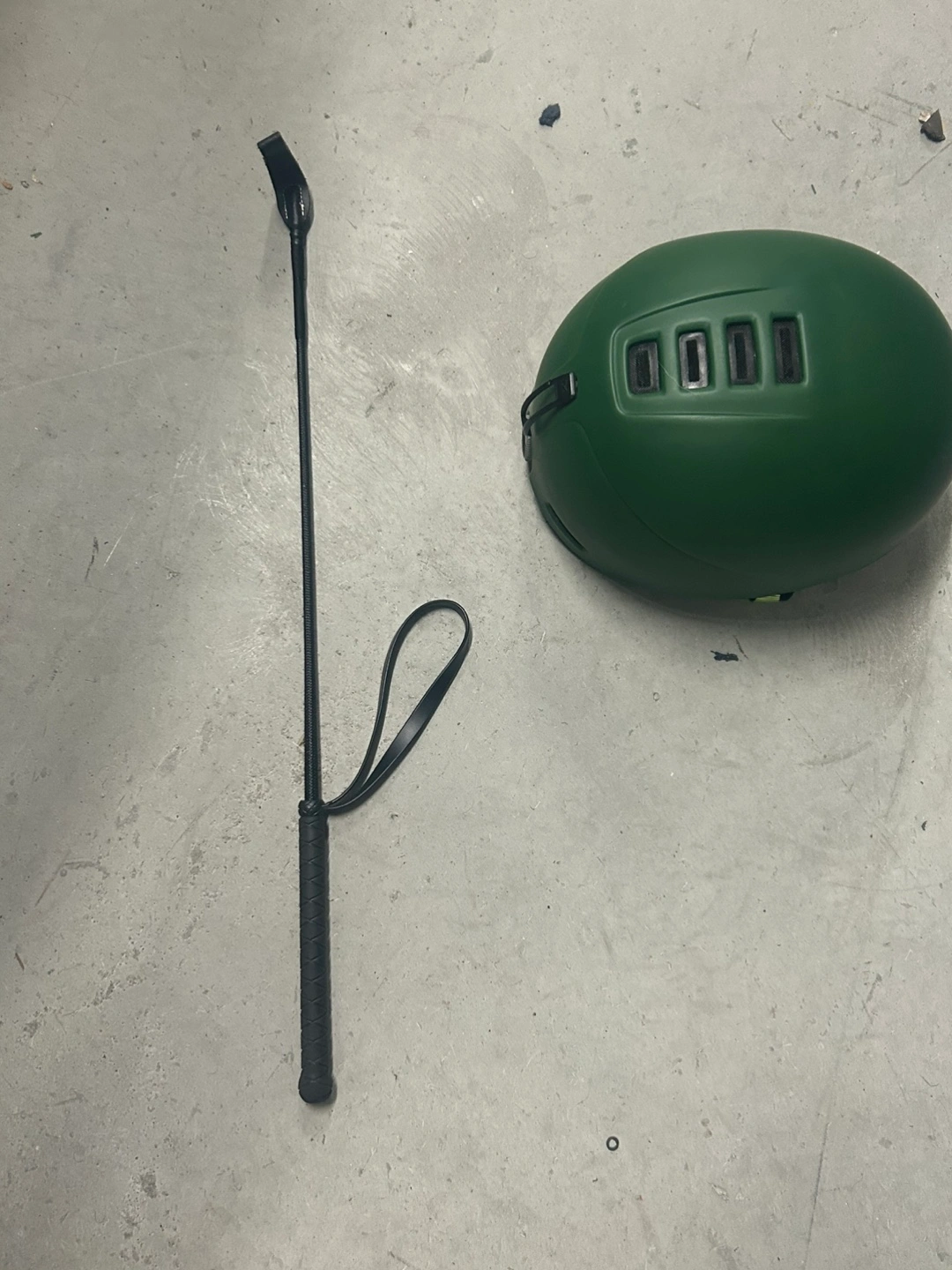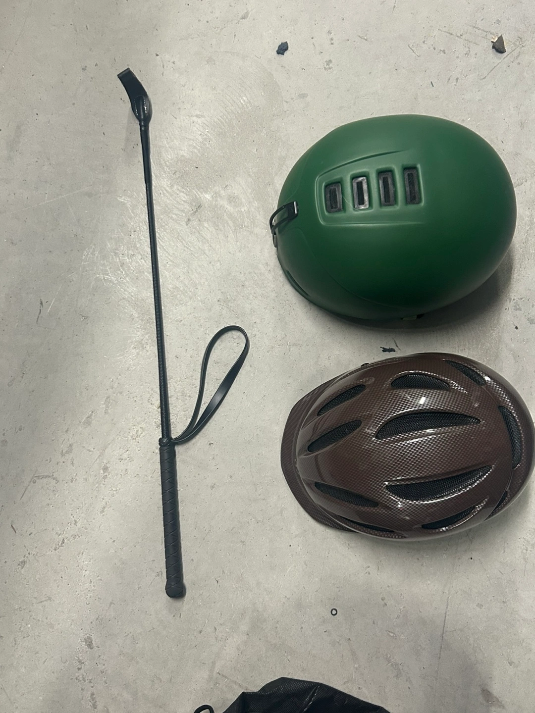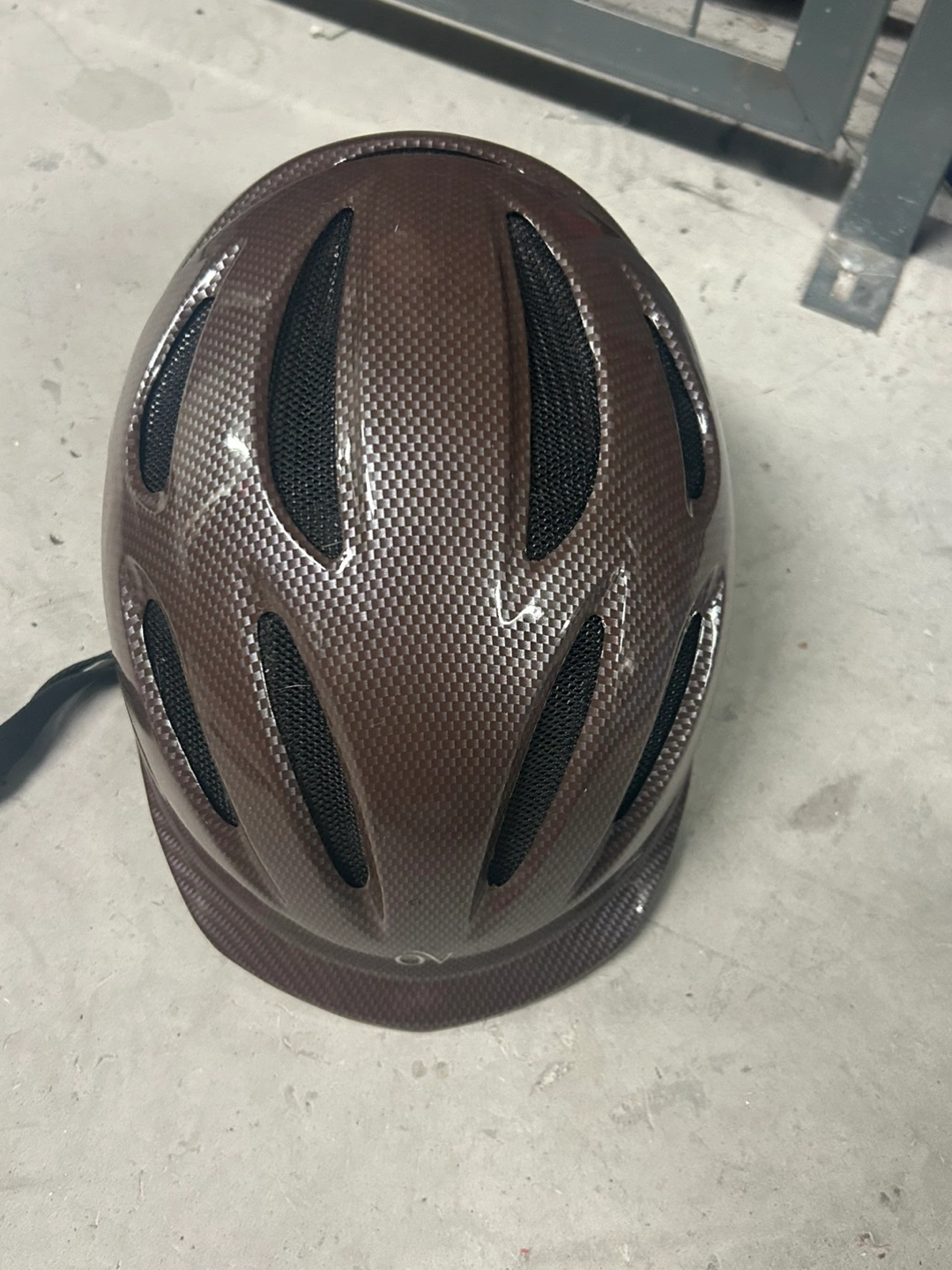 Selling a brown & green horseback riding helmet. It has a unique carbon fibre-like texture and is in good condition.