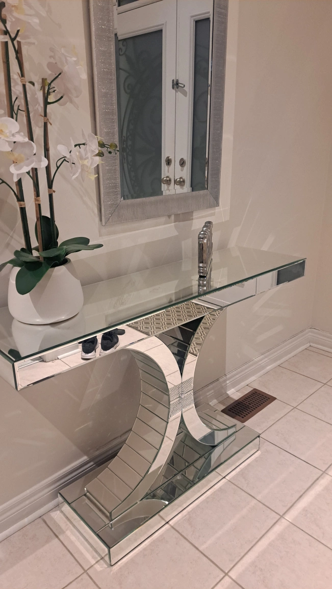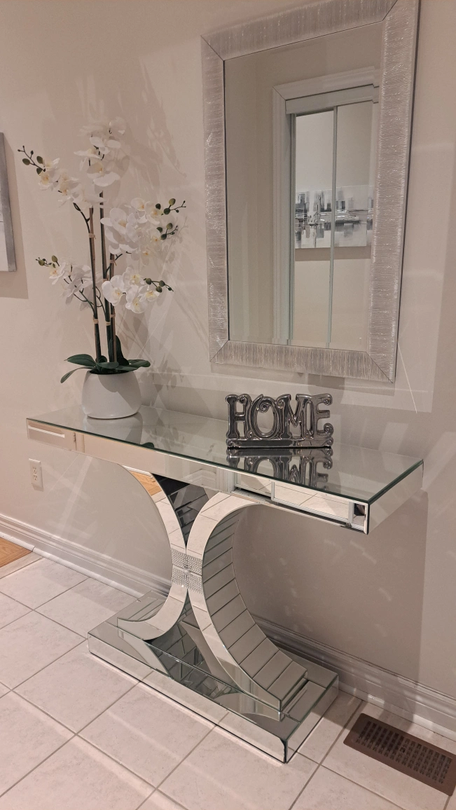 Moving sale.! Selling a beautiful mirrored console table. It's in good condition just a couple of cracks in the corner. It would look lovely in an entryway or living room! The mirrored finish adds a touch of elegance and reflects light beautifully, making the space feel brighter and more open. No delivery, pick up only