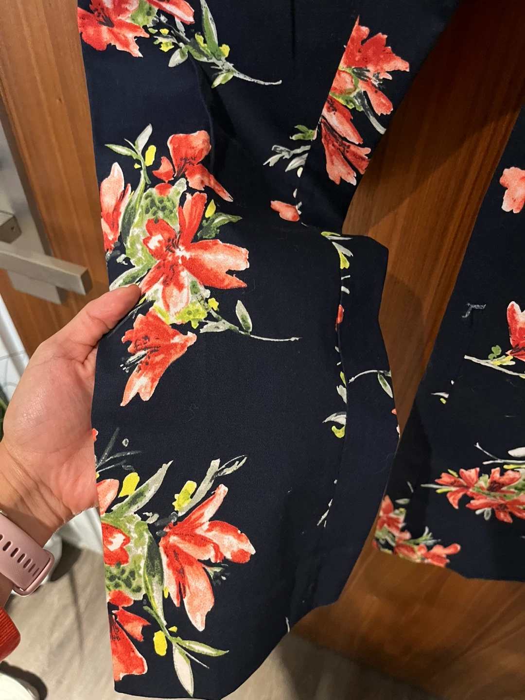 These pants have a black background with a bright floral print. They're perfect for adding a pop of colour!