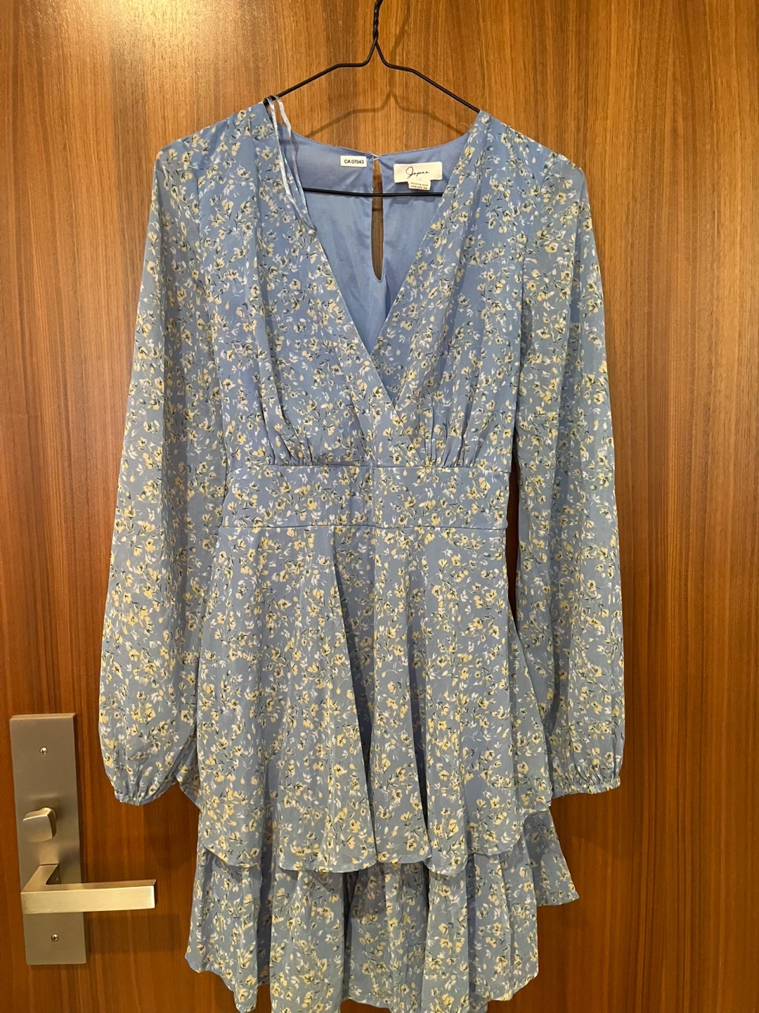 Selling a cute Joyous mini dress with a floral print! It's a light blue colour and has long sleeves. The dress is a size small and features a tiered ruffle skirt. Perfect for spring or summer!