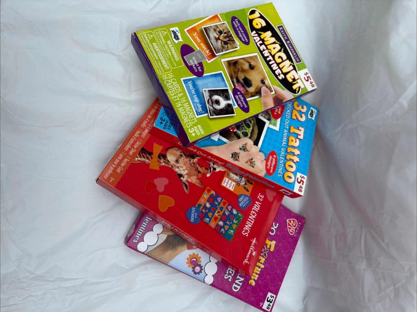 Selling a bundle of Valentine's Day cards for kids. Includes: - Hallmark 32 Valentines with teacher card and envelopes and stickers - Keith Kimberlin 16 Magnet Valentines - Meilo Smello 32 Tattoo Animal Valentines - valentine fortunes Adults like to celebrate Valentine’s Day too. $2 each or all four (4) for $6