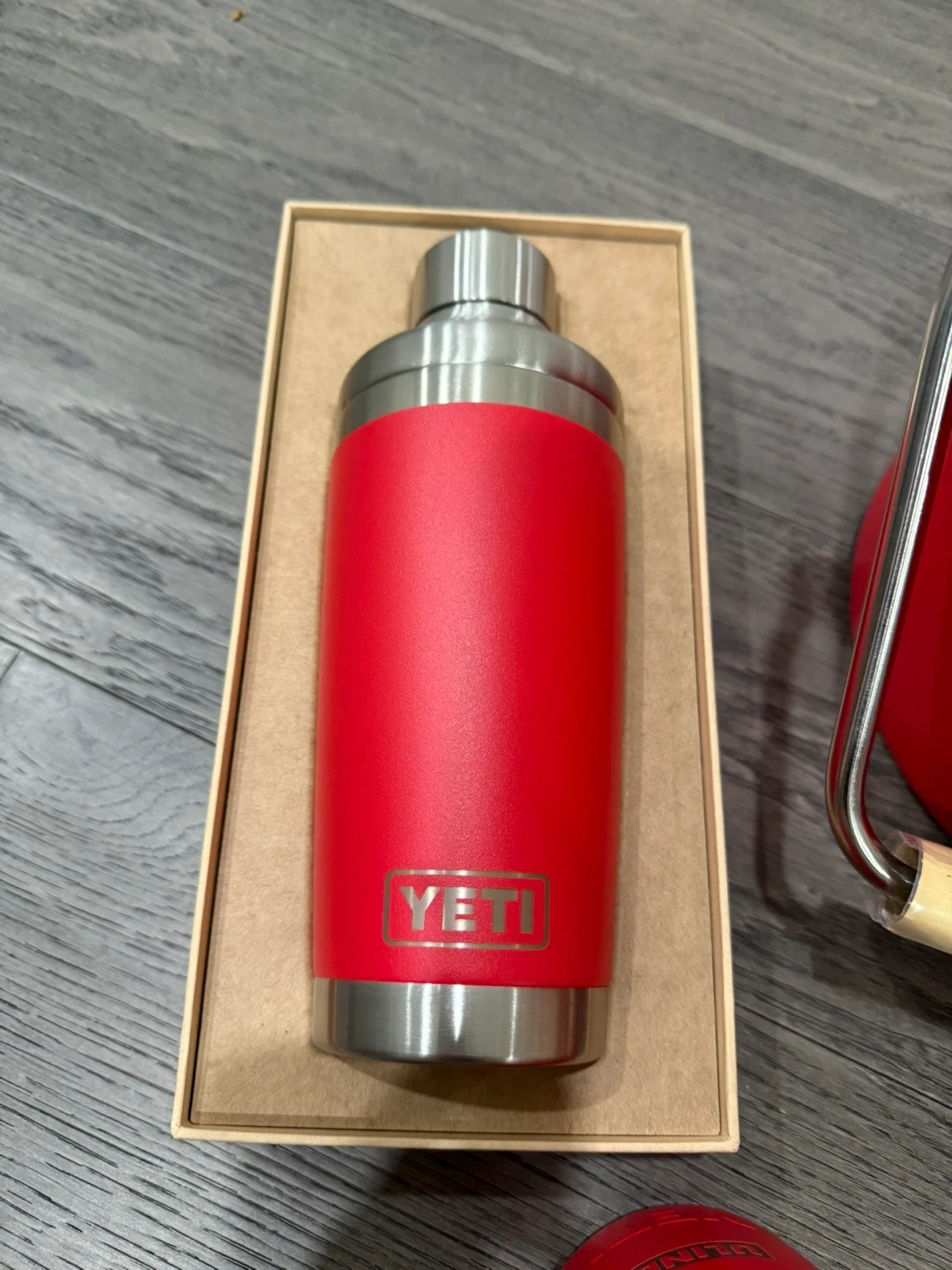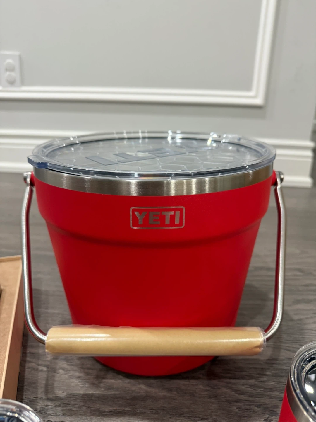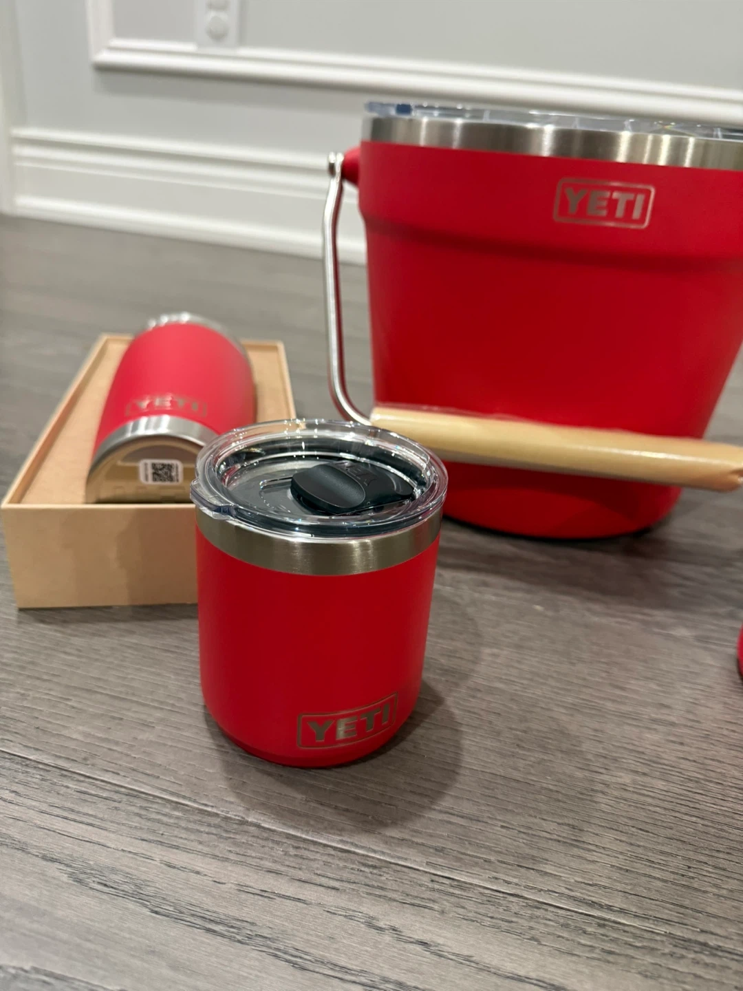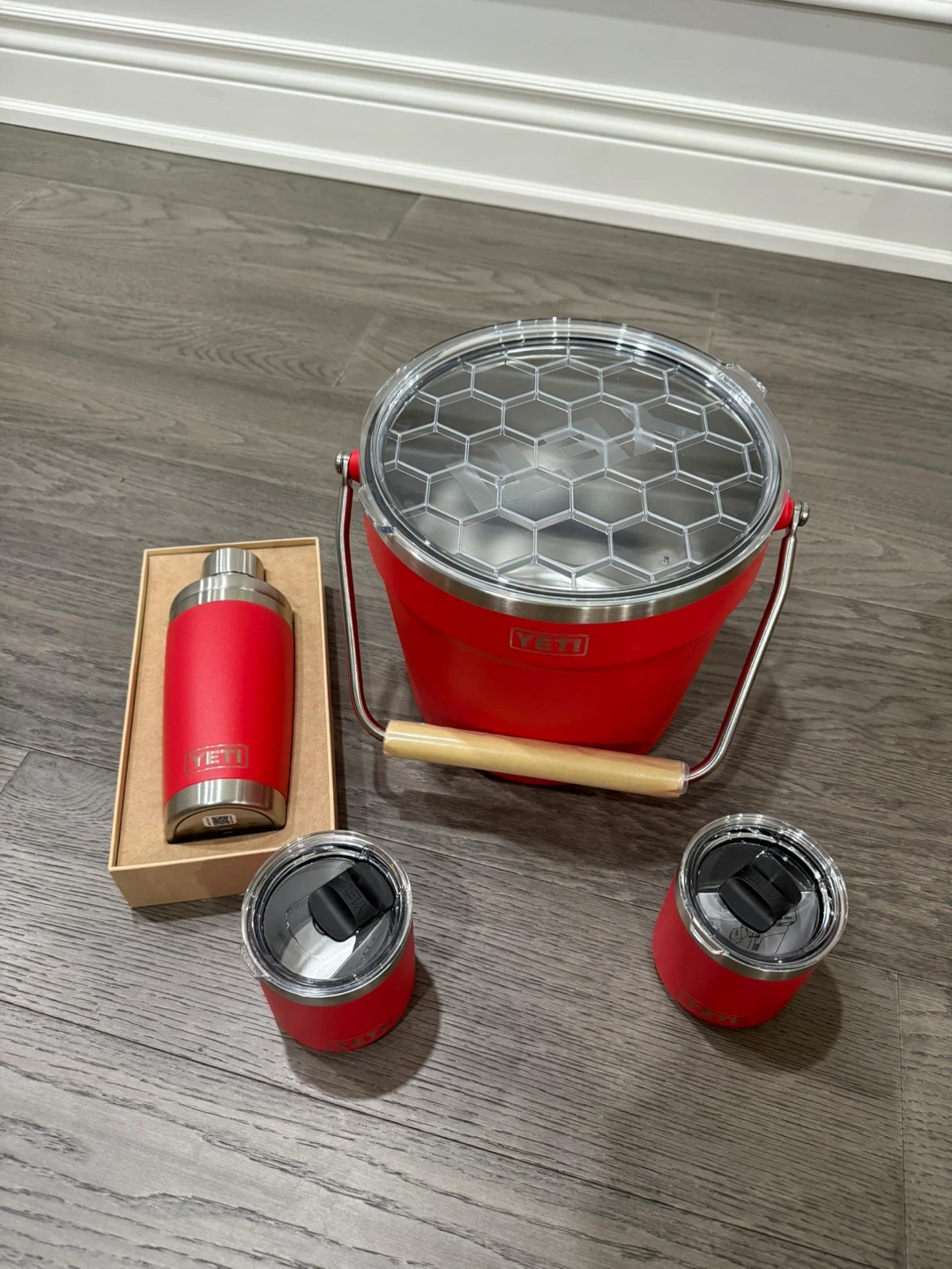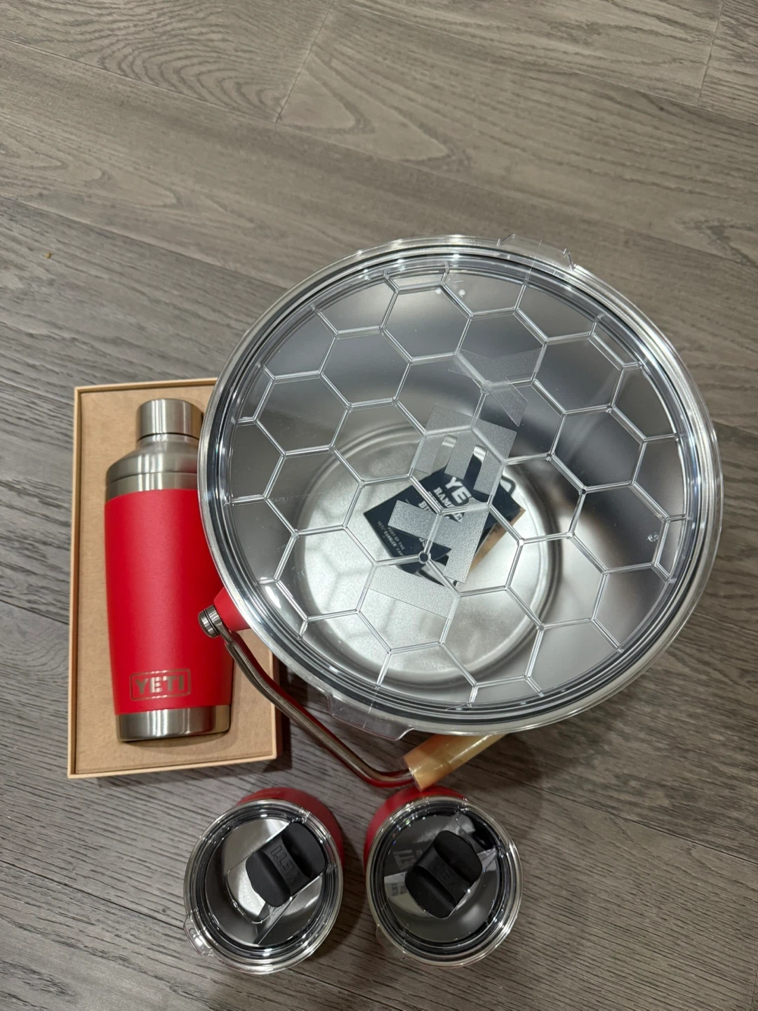 YETI PARTY SET, set includes a shaker, two tumblers, and a bucket, all in NEW condition. The set comes with the original boxes, currently retails for $415 with tax