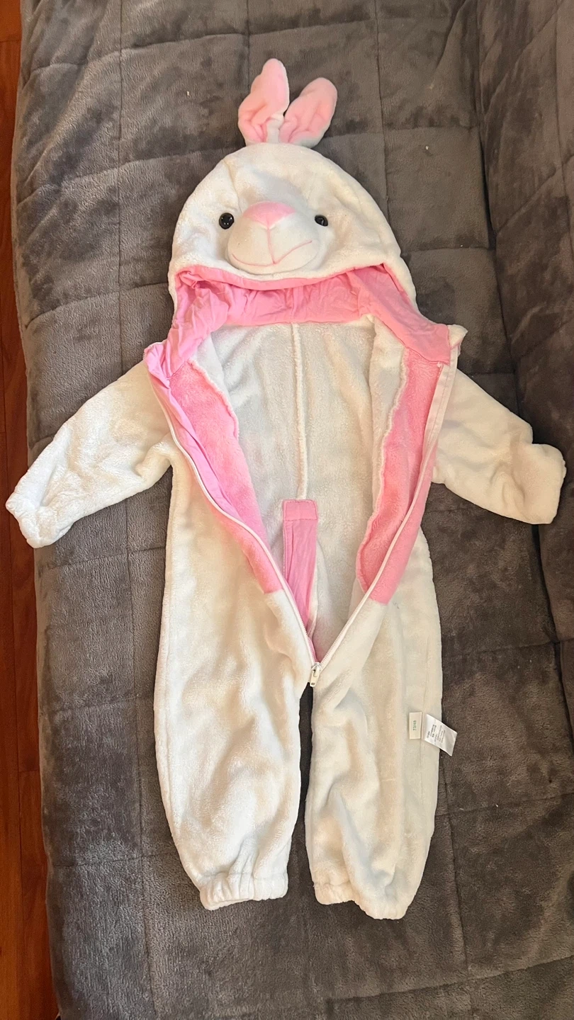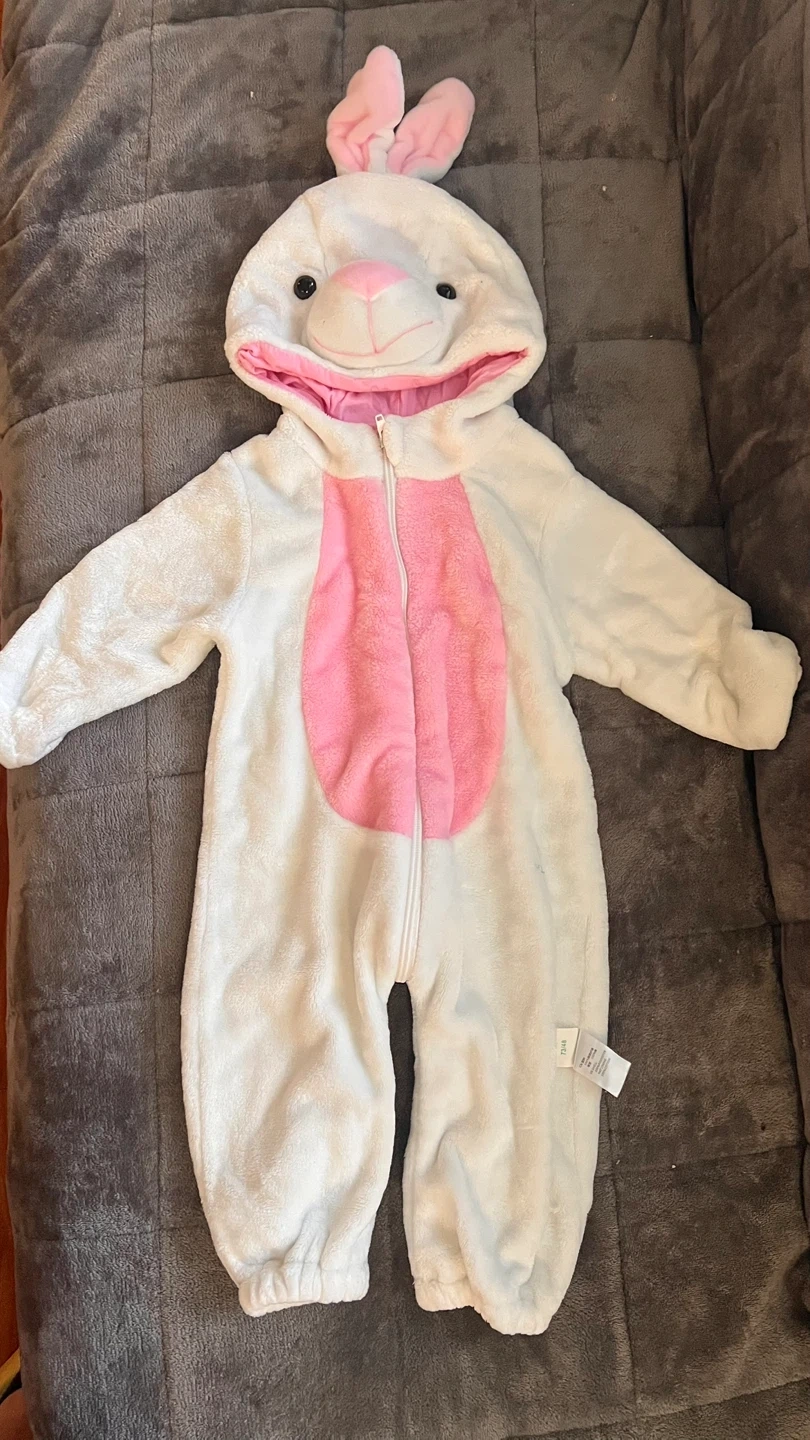 Aww, how cute is this bunny costume! It's a soft, plush onesie in white and pink, perfect for a little one aged 12-18 months. Imagine the adorable photos you could take! It's in great condition and ready for a new home