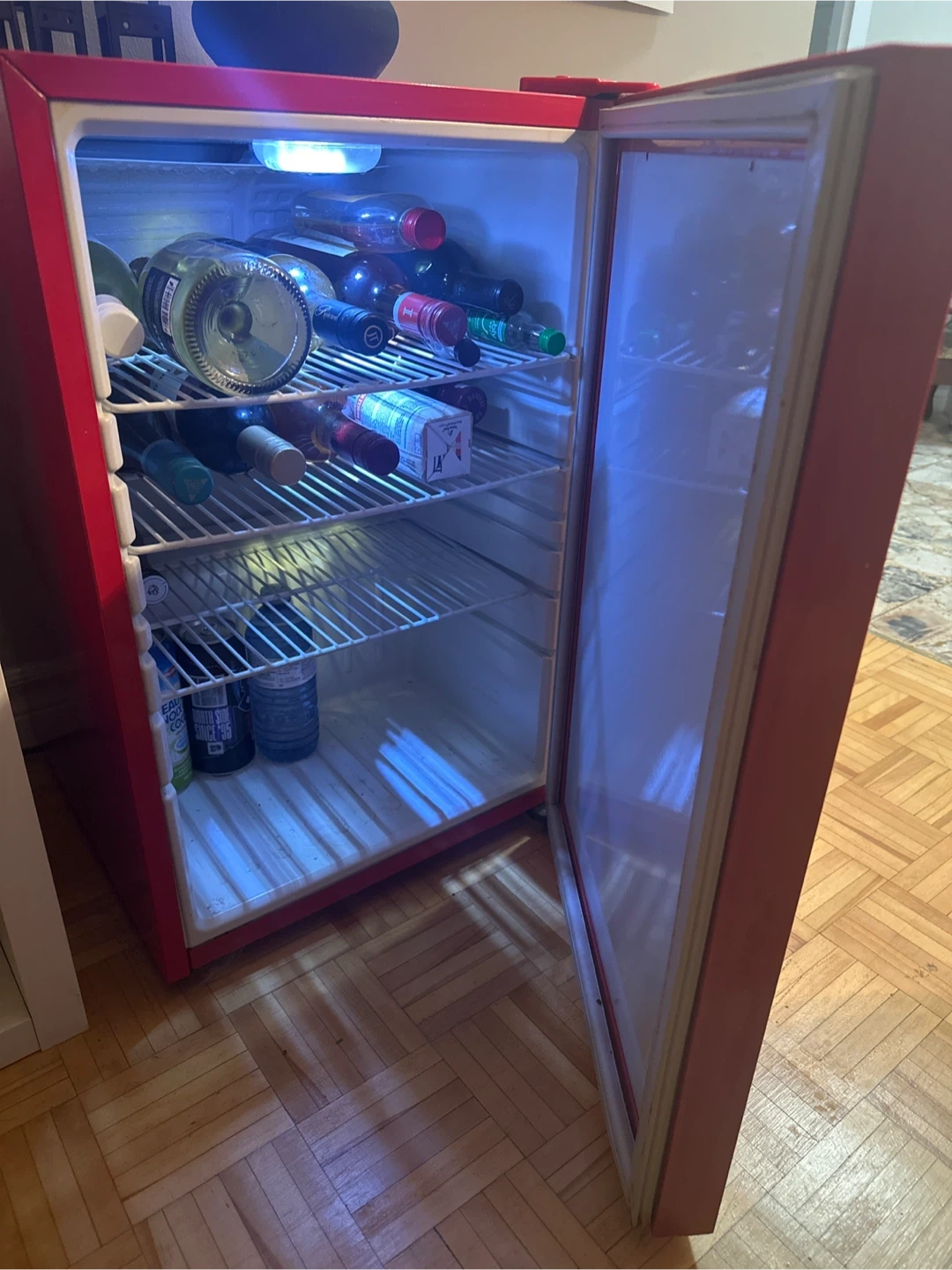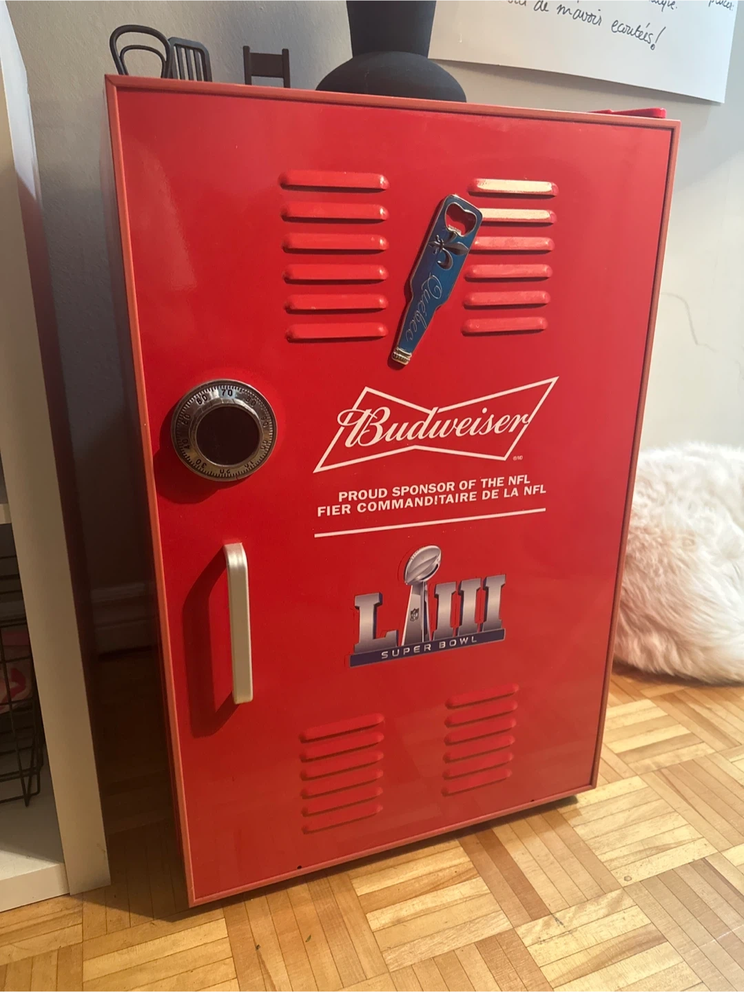 Selling a Budweiser special serie mini fridge, perfect for keeping your drinks cool. It's red and features the Budweiser logo along with NFL branding. Great for a games room or bar area!