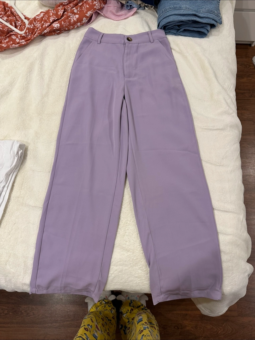 These are a pair of wide leg pants in a lovely lilac colour! They're super comfortable and perfect for a casual day out or dressing up for an evening event