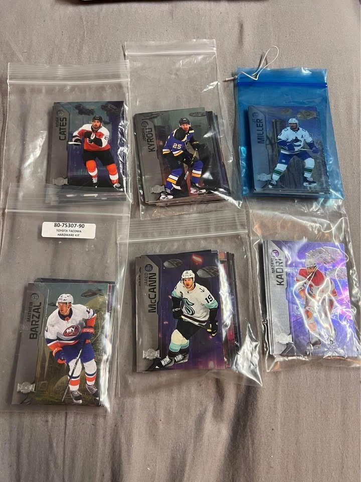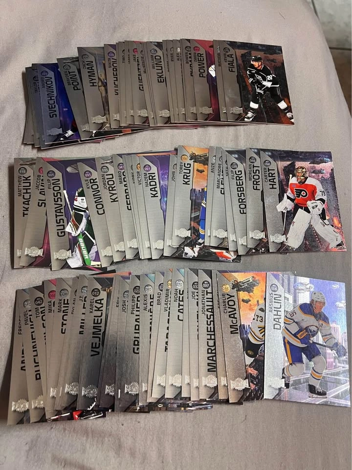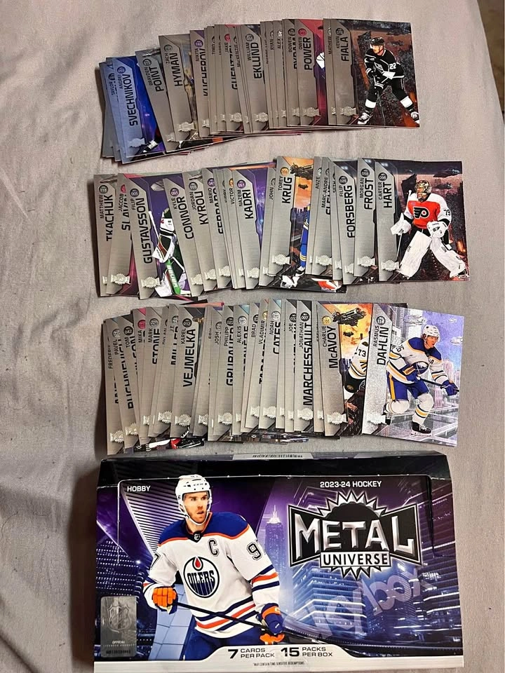 For sale: New 2023-24 Skybox Metal Universe Hockey Cards Mystery Pack. Every pack includes 10 new random hockey cards. $5 each. Guaranteed 1 gold card in each pack. Buy all for $25.