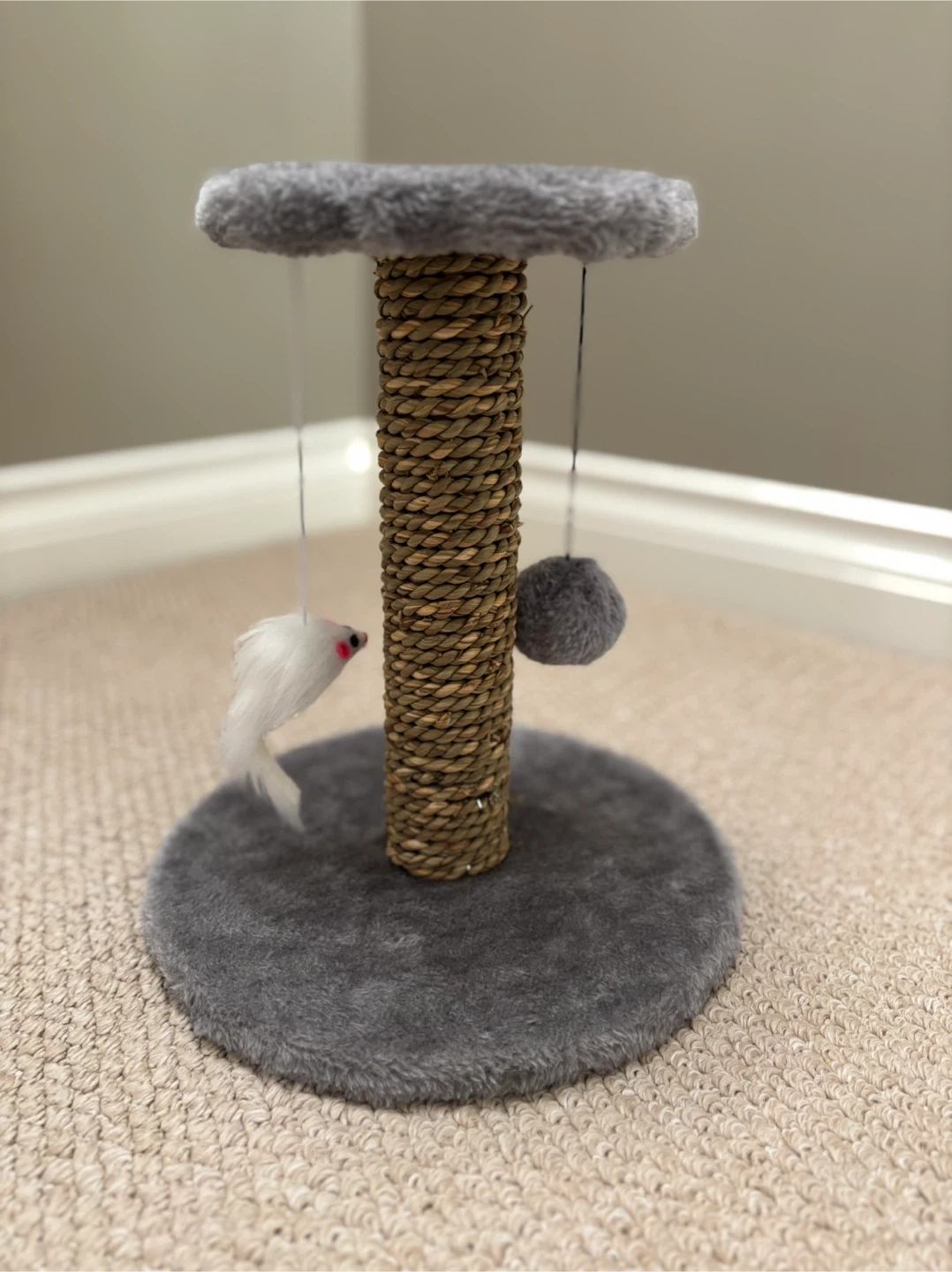 Selling a cute little cat scratching post! It's in great shape and comes with a scratching post wrapped in natural fibres, a cozy platform on top, and two hanging toys for your kitty to play with. Perfect for keeping your cat entertained and saving your furniture from scratches - NEVER USED (BRAND NEW)